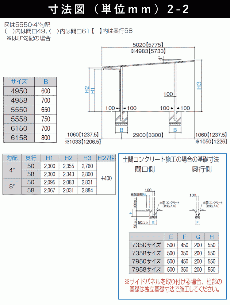 ※奥行、高さH1寸法は4°勾配の場合です。8°勾配の場合は寸法図画像2-2をご確認下さい。 ▽ 仕様
