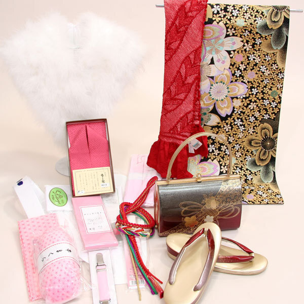 項目 | 振袖フルセット レンタル ~小物まですべて揃う:20点フルセット~ ・振袖仕立て上がり ・長襦袢仕立て上がり ・袋帯 ・帯揚げ ・帯締め ・重ね衿 ・ショール ・草履バッグセット ・着物スリップ ・帯枕 ・前板 ・後板 ・腰紐4本 ・伊達締め ・マジックベルト ・三重仮紐 ・着付ベルト ・衿芯 ・足袋 |
