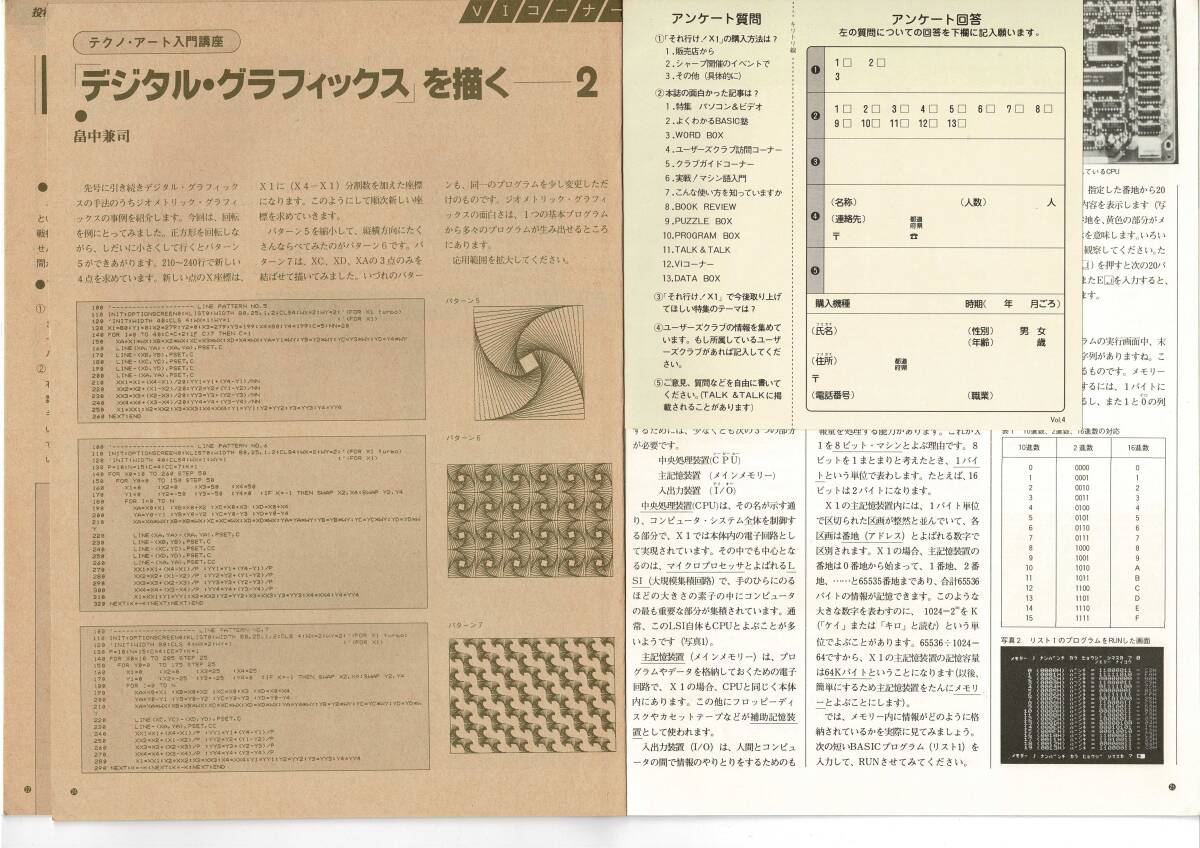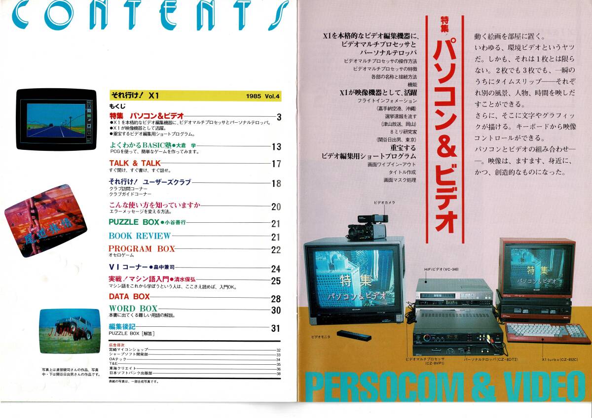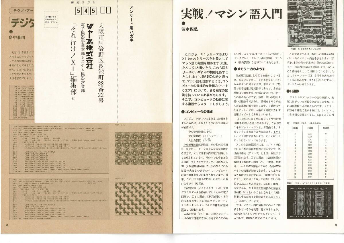 それ行け!X1Vol. 4,1985_昭和60年 4月 1日 隔月刊,BASIC塾 大倉学,畠中兼司,小谷善行,渡部健司,関谷日出男,清水保弘 発売日 1985_昭和60年 4月 1日 隔月刊 発行 シャープ 大きさ A4 バックナンバー申込用紙,アンケートハガキ付 X1コミュニケーションマガジン 表紙の写真は、 一部合成写真です。 それ行け! X1 1985 Vol.4 もくじ 特集 パソコン&ビデオ 3 ●X1を本格的なビデオ編集機器に、 ビデオマルチプロセッサとパーソナルテロッパ。 ●X1が映像機器として活躍。 ●重宝するビデオ編集用ショートプログラム。 よくわかるBASIC塾 ●大倉学 13 PCGを使って、簡単なゲームを作ってみます。 TALK & TALK 17 すぐ聞け、 すぐ書け、すぐ話せ。 それ行け! ユーザーズクラブ 18 クラブ訪問コーナー クラブガイドコーナー こんな使い方を知っていますか 20 エラーメッセージを変える方法。 PUZZLE BOX ● 小谷善行 21 BOOK REVIEW 21 PROGRAM BOX 22 オセロゲーム VIコーナー●畠中兼司 24 実戦!!マシン語入門 ●清水保弘 25 マシン語をこれから学ぼうという人は、ここさえ読めば、 入門OK。 DATA BOX 28 WORD BOX 30 本書に出てくる難しい用語の解説。 編集後記 31 PUZZLE BOX [解答 ] 広告目次 宮崎マイコンショップ -32 シャープソフト開発部 -33 OAテック -34 T&E- -35 東海クリエイト -36 日本ソフトバンク出版部・ -38 写真上は渡部健司さんの作品、写真 中・下は関谷日出男さんの作品です。 31ページ 編集後記 古本です。 神経質な方の入札はご遠慮ください。 背表紙の一部(ホッチキス部分)や本の中等をセロテープで補修している本もあります。 経年による劣化(すれ、ヤケ、シミ、折れ、小さい破れ、汚れ等)があります。 落書き、ページ割れ,ページ抜け、見落とし等が、あるかもしれません。 気になる点などあれば、事前に質問して下さい。 この商品の発送後は、クレーム、返品は、お断り致します。