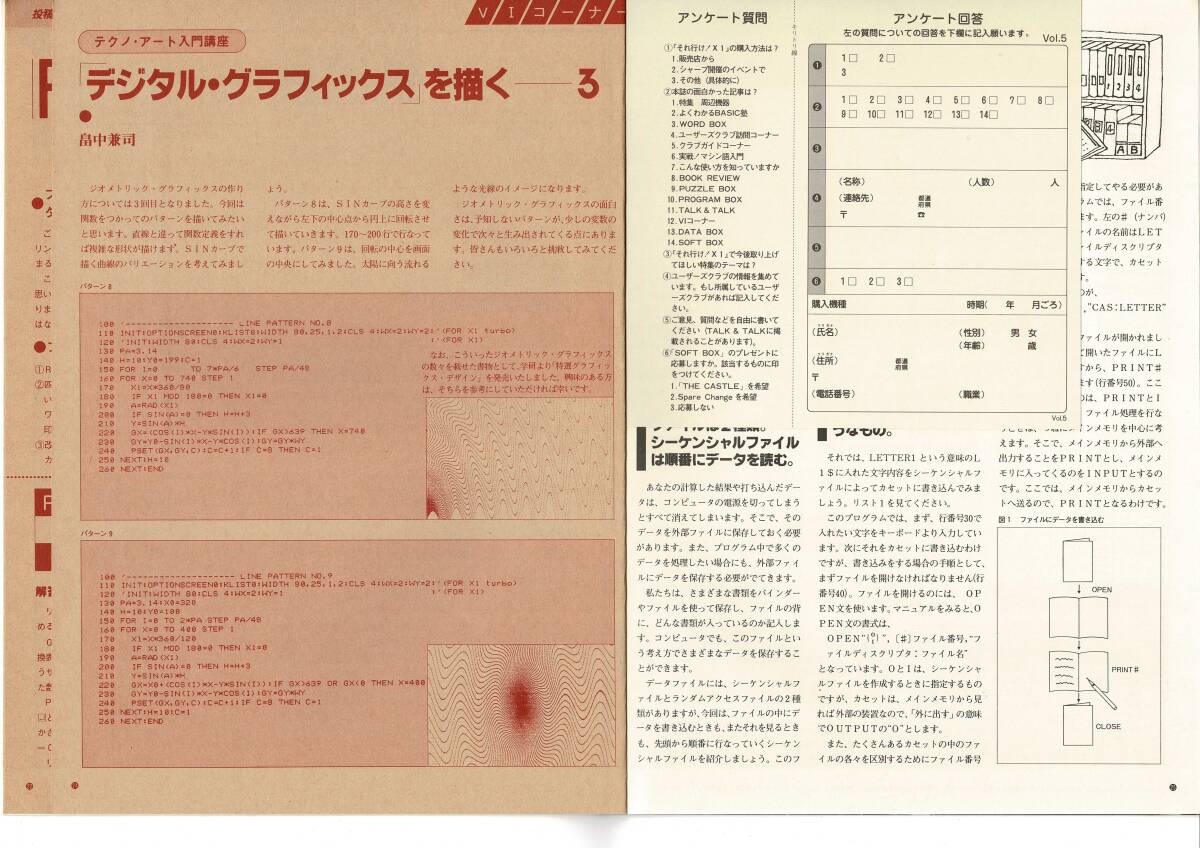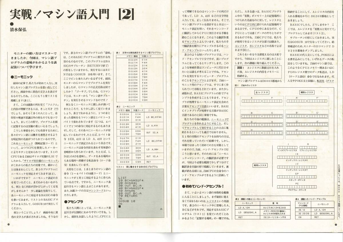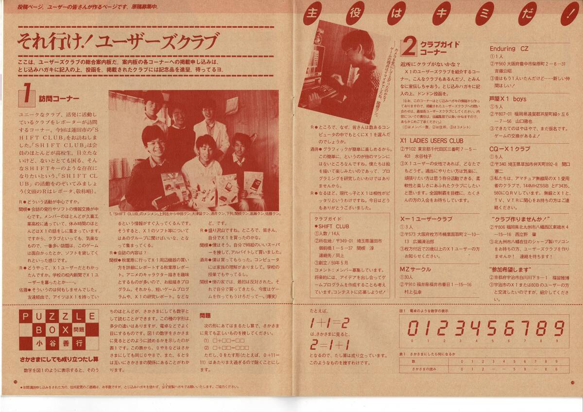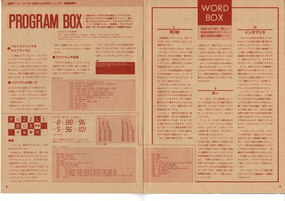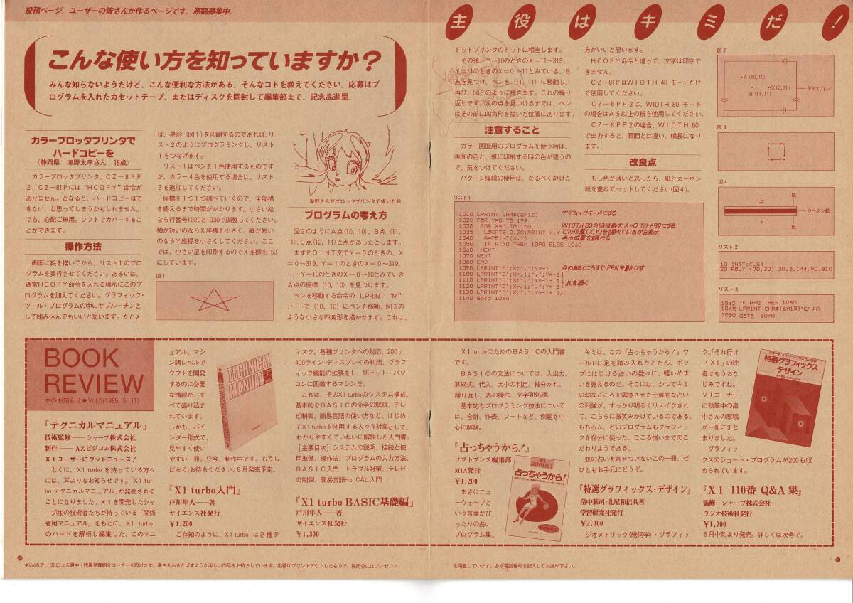 それ行け!X1Vol. 5,1985_昭和60年 6月 1日 隔月刊,BASIC塾 大倉学,畠中兼司,小谷善行,清水保弘,水谷さん,畠中さん 発売日 1985_昭和60年 6月 1日 隔月刊 発行 シャープ 大きさ A4 バックナンバー申込用紙,アンケートハガキ付 X1コミュニケーションマガジン 表紙のCZ-850Dの画面はハメコミ合成写真です。 それ行け! X1 1985 Vol.5 もくじ 特集・周辺機器 4 ●周辺機器Q&A ●RS-232C を使ってみよう。 TALK & TALK 17 すぐ聞け、すぐ書け、 すぐ話せ。 それ行け! ユーザーズクラブ- 18 クラブ訪問コーナー クラブガイドコーナー PUZZLE BOX ●小谷善行 18 こんな使い方を知っていますか? 20 プロッタプリンタでハードコピーを。 BOOK REVIEW 20 PROGRAM BOX 22 プロッタプリンタをタイプライタに。 PUZZLE BOX [解答] 22 WORD BOX 23 本書に出てくる難しい用語を解説。 VIコーナー●畠中兼司 24 よくわかる BASIC塾●大倉 学 25 シーケンシャルファイルの作り方。 実戦! マシン語入門 ●清水保弘 28 マシン語プログラムを読む。 DATA BOX 31 SOFT BOX 32 編集後記 33 広告目次 シャープ(株)ソフト開発部- - 2 (株)高木学園OAテック -34 (株)キャリーラボー -35 (株)東海クリエイト -36 (株)日本ソフトバンク出版部- -38 33ページ 編集後記 画面の写真は、 X1 LADIES CLUB代表の水谷 さん(上)、およびVIコーナーの畠中さん(中・下) の作品。 古本です。 神経質な方の入札はご遠慮ください。 背表紙の一部(ホッチキス部分)や本の中等をセロテープで補修している本もあります。 経年による劣化(すれ、ヤケ、シミ、折れ、小さい破れ、汚れ等)があります。 落書き、ページ割れ,ページ抜け、見落とし等が、あるかもしれません。 気になる点などあれば、事前に質問して下さい。 この商品の発送後は、クレーム、返品は、お断り致します。