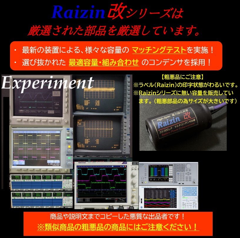 感動!このパワーをぜひ体感してください ■噂のRaizin改 ■ ★強力・高性能バッテリー電力強化装置キット★ 《49,000μFハイパワータイプ》 ★本物をお選びください★ 《オークション旧 ID:pcjrからそのまま移行して出品しております》 旧 ID: "pcjr" では評価合計 26,500件(延べ45,000件)の ご評価有難うございました。 《pcjrの評価はここをクリック》 ※ラベルも真似して製作されており、 ※文章・タイトル・コメントまで丸コピーされていますのでご注意ください。 ※出品ID:pcjrの商品説明を丸コピーしているにも関わらず、 自身正規品で、文章もコピーされたと記載しているので悪質です。 悪質な出品者でリストに掲載されております。 コンプライアンスを守らない出品者からはお買い求めならないように ご注意ください。 |