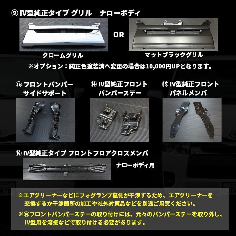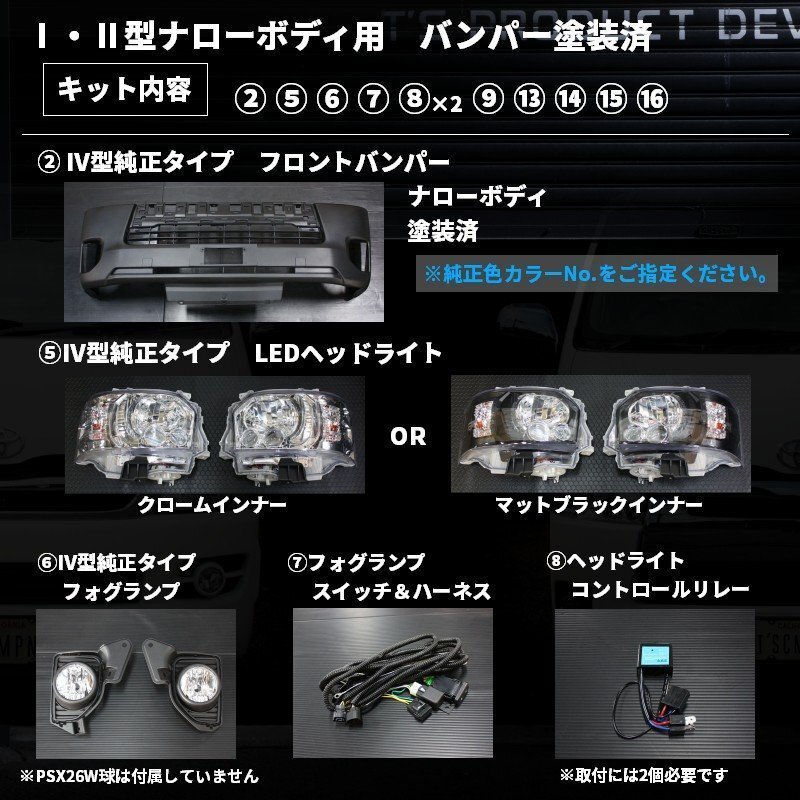 | 商品説明 | こちらの商品はフロントバンパー塗装済となります。 純正色塗装のカラーナンバーをご指定ください。 ※受注後、塗装を行いますので納期20日~30日程かかります。(定休日除く) 塗装の混み具合によって納期の変動がございます。お問合せをお願い致します。 【キット内容】 ②4型 純正タイプ フロントバンパー ナロー 塗装済 (純正色塗装カラーをご選択ください。) ⑤4型 純正タイプ LEDヘッドライト (クロームインナー、マットブラックインナーをご選択ください。) ⑥4型 純正タイプ フォグランプ【PSX26W球は付属しておりません】 ⑦フェイスチェンジ用フォグランプスイッチ&ハーネスセット ⑧フェイスチェンジ用コントロールリレーユニット x2個 ⑨4型 純正タイプ グリル (クローム、マットブラックをご選択ください。) ※純正色塗装済へは +10000円UPで変更可能です。 ⑬4型 純正タイプ フロントバンパーサイドサポート(L/Rセット) ⑭4型 純正 フロントバンパーステー(L/Rセット) ⑮4型 純正 フロントパネルメンバ リインホースメント(L/Rセット) ⑯4型 純正タイプ フロントフロアクロスメンバ リインホースメント ※エアクリーナーやインテーク・レゾネーター周辺にパーツの干渉がありますので、 エアクリーナーを交換するか干渉部分を加工して対応する必要があります。 ※ヘッドライト内側のバンパーとヘッドライトを固定するためのバンパーステーは 元々のバンパーステーを取り外し、4型用を溶接などで取り付けする必要があります。 <商品説明> 1・2型から4型へフェイスチェンジするために必要なパーツのセットになります。 ガソリン車用のキットになります。 標準ボディ(ナローボディ)用になります。 ※ヘッドライトとグリルのカラーをご注文時にご指定下さい。 LEDヘッドライトはクロームインナーとマットブラックインナーの2種類からご選択いただけます。 グリルはクロームとマットブラックの2種類からご選択いただけます。 (10000円UPで純正色塗装済グリルに変更が可能です。変更希望の方はご指定下さい。) 各パーツの説明は各パーツ単体の商品説明をご確認ください。 ※純正パーツの入荷に数日かかる場合がございますので予めご了承お願い致します。 ※取り付けのクリップなどは付属しておりませんのでご注意ください。 |