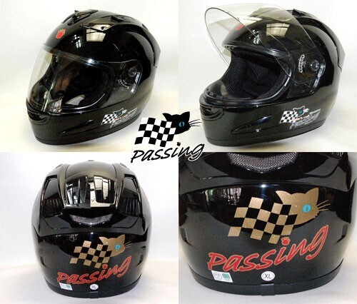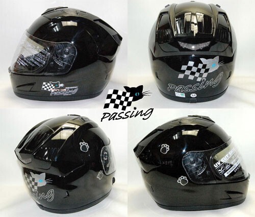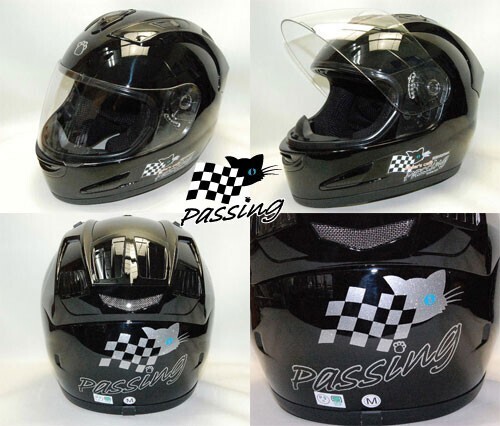 黒猫キャラクターブルーアイちゃんのパッシング・フルフェイスヘルメットです。 ■サイズは L59~60㎝ 他に、Mサイズ57~58㎝ と XLサイズ61~62㎝がございますので変更も可能です。 【調整スポンジもお付けいたします。】 当店のオリジナルステッカーもプレゼント! ご希望でPassingの文字の部分をご希望のネームに変更出来ます。 【8文字までで、落札後にご連絡をお願いいたします。】 キラキラのメタリック素材・屋外対応のステッカーで猫ちゃんとにゃんこ手形を上から剥がれにくい様にクリアーでコーティングもしてあります。 ■あご紐はワンタッチ式 ■内装は、取り外し可能で洗えます。 ■通気性を考えたベンチレーション機能付き ■SG規格適合品(全排気量対応) シールドはUVカットの透明が付いております。 ★別売り2800円プラスで下記のシールドのお色も追加できますので、落札後にご連絡くださいませ。 【かんたん決算のときに、送料の方にプラスで追加可能です。】 ①ライトスモークシールド ④スモークシールド ⑤ミラーレインボーシールド ⑥ミラーシルバーシールド 【④~⑥は濃いめのお色となりますので夜間には見えにくいです。】