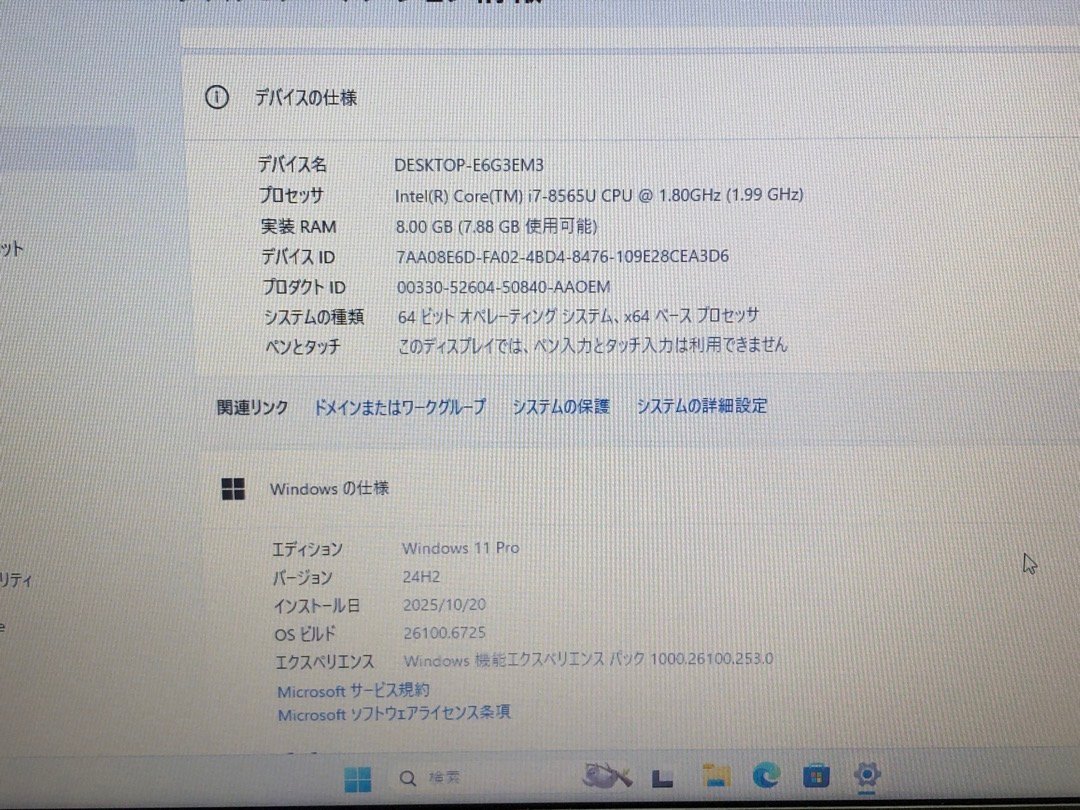 CPU | Intel(R) Core(TM) i7-8565U CPU @ 1.80GHz | 光学式ドライブ | なし |