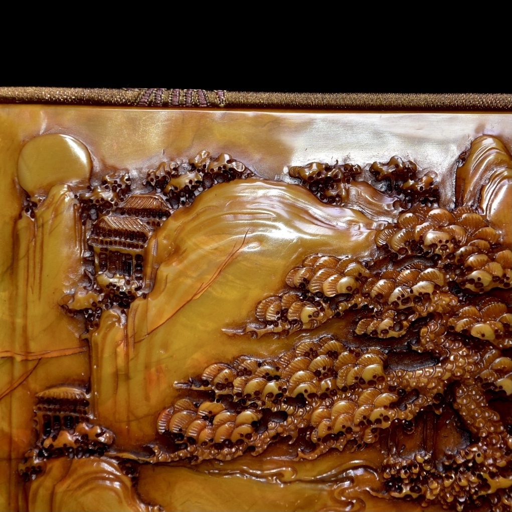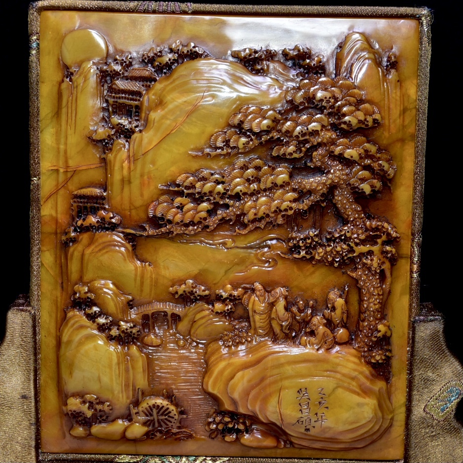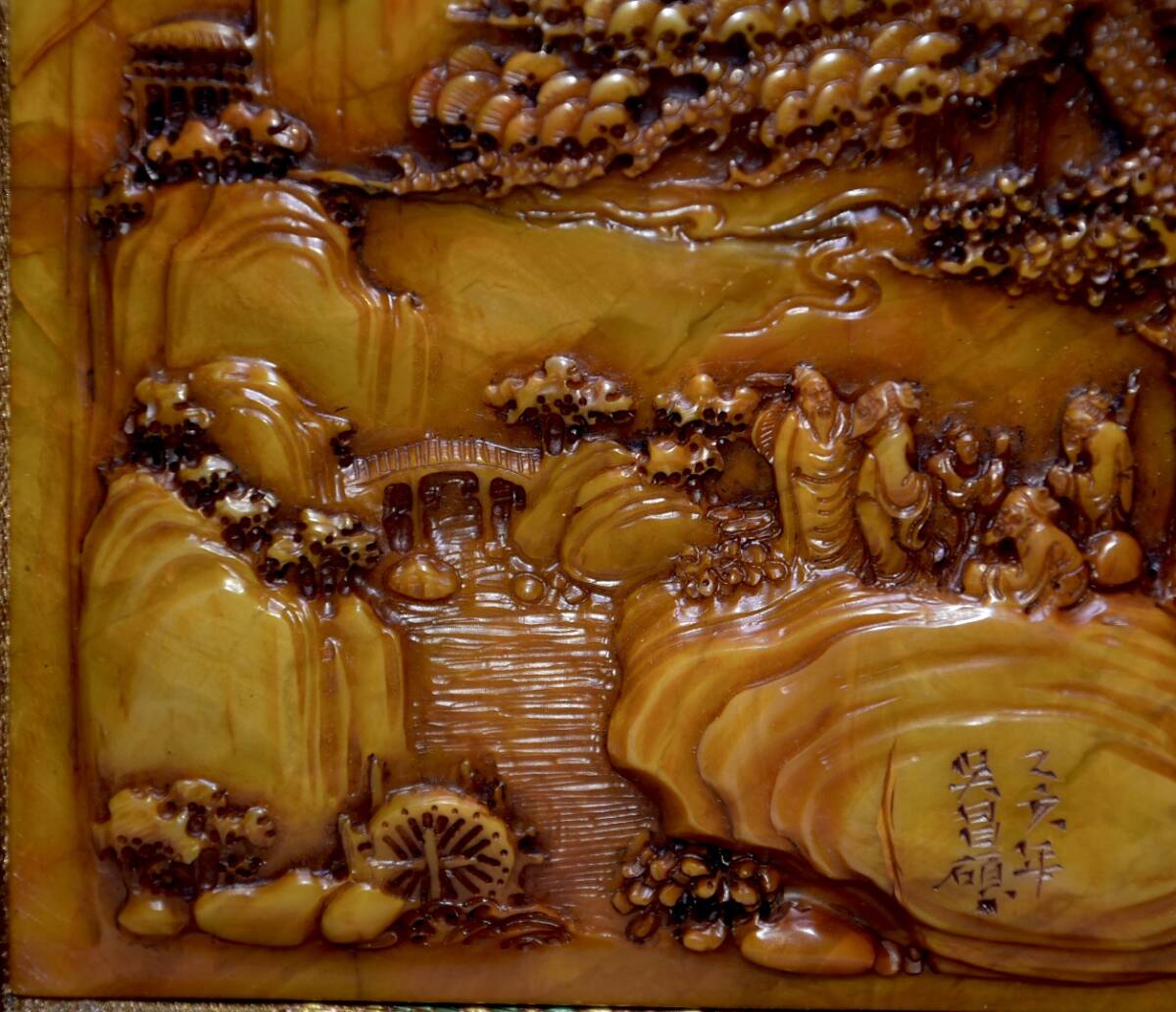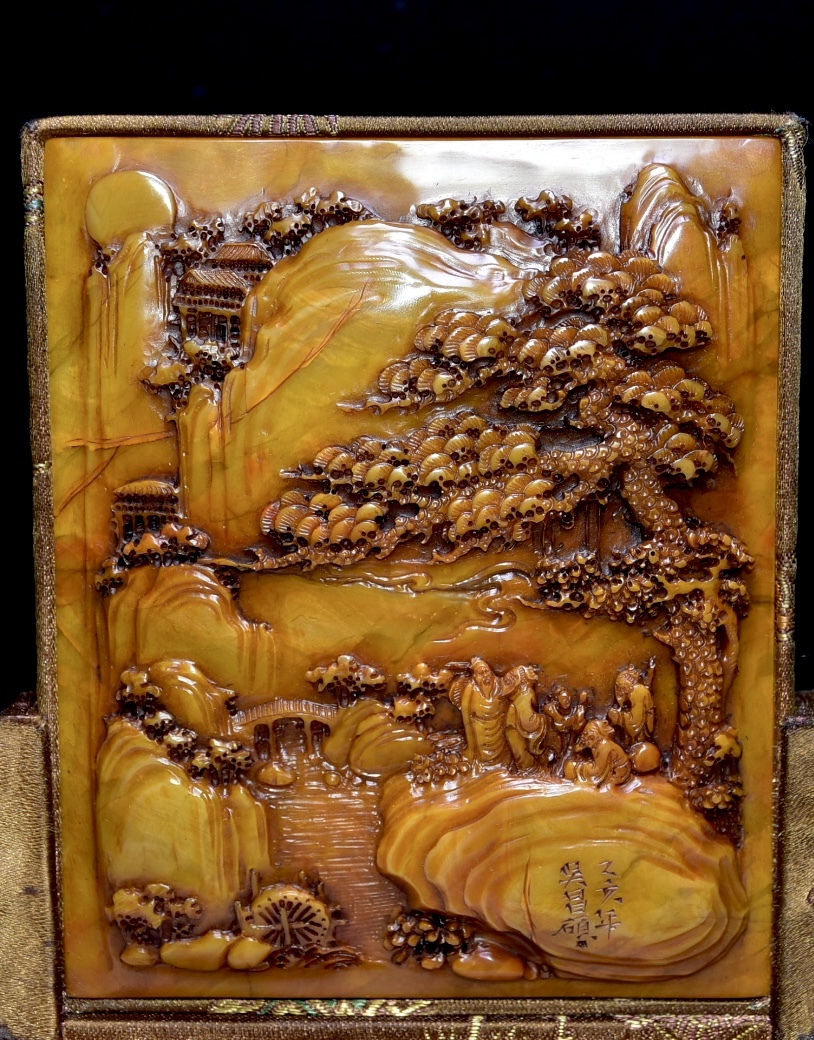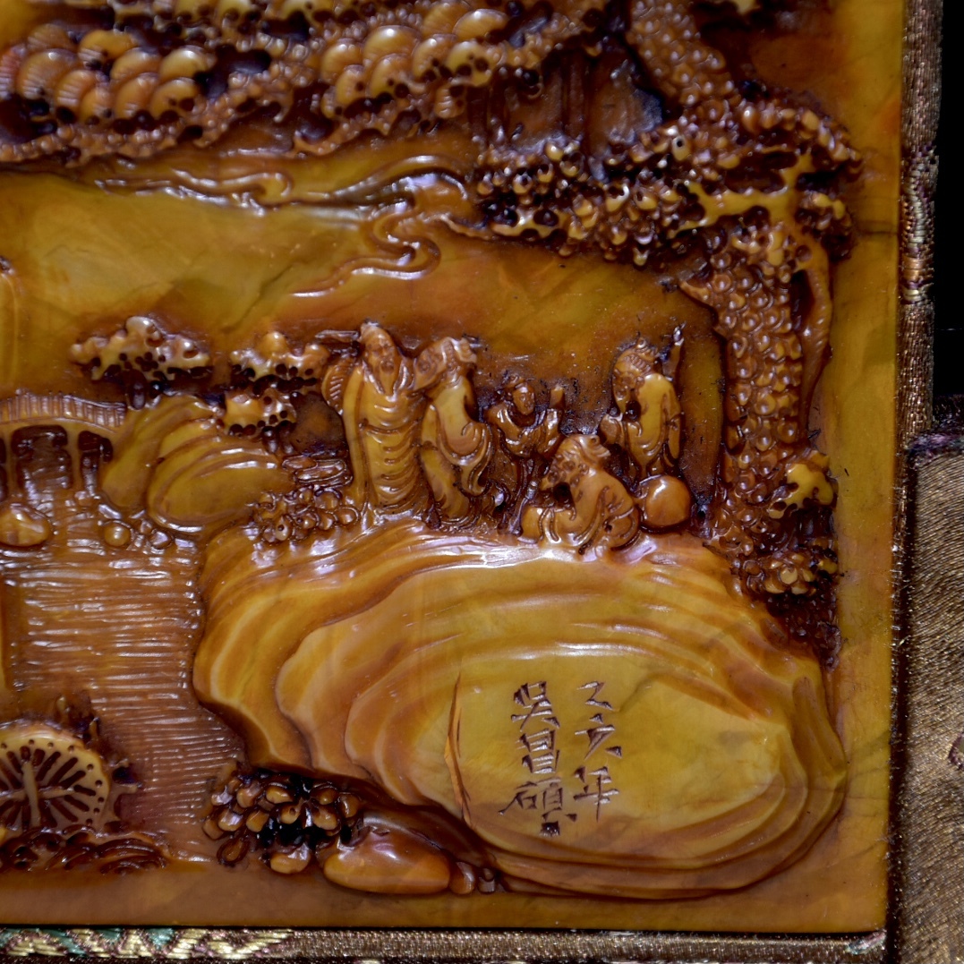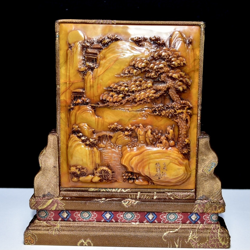 ◆御泓軒◆『清朝時代 寿山石 田黄石彫 松下雅聚屏風置物 呉昌碩作 箱付』極細工・古賞物・中国古玩・中国古美術