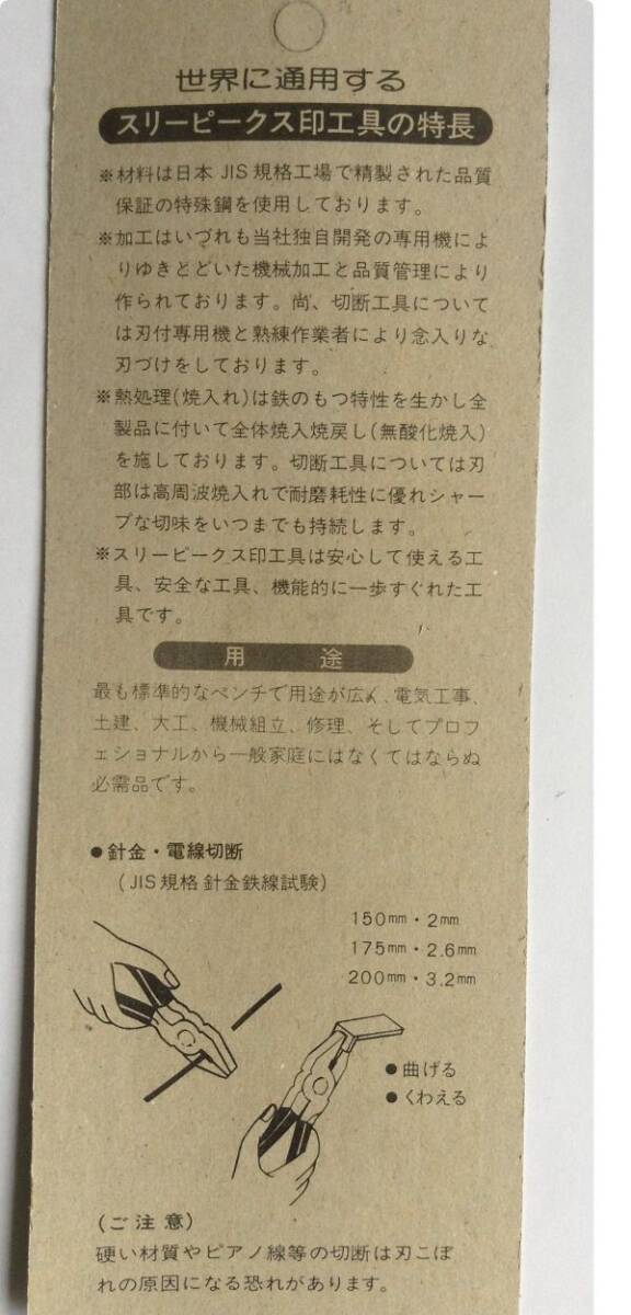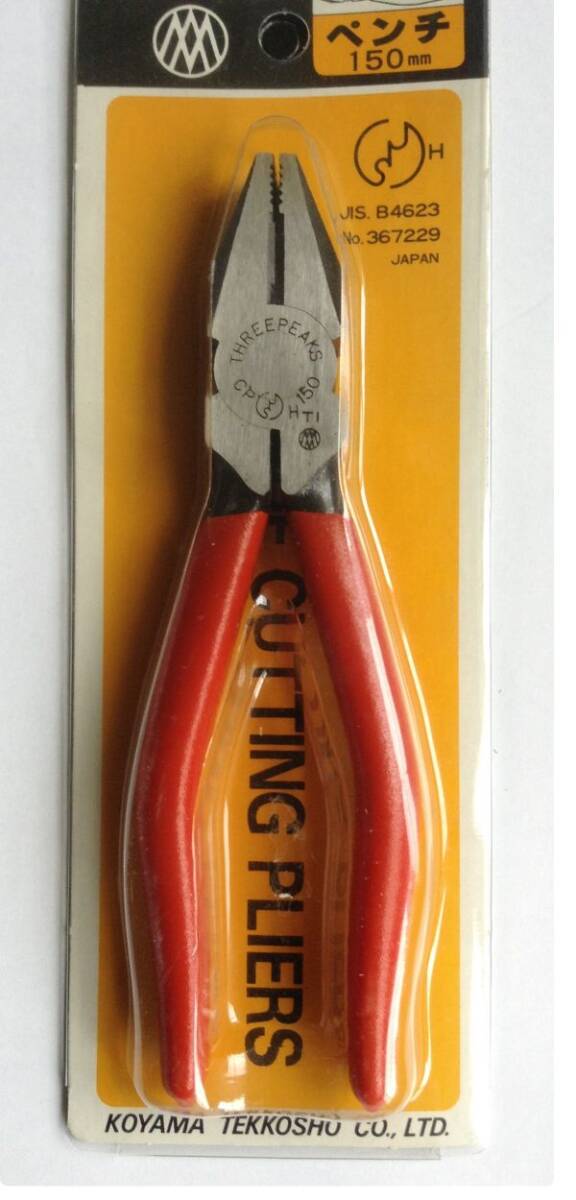 ◎倉庫を整理したところ奥から出てきた旧いペンチ、サイズは150㎜です 新潟の小山鉄工所(スリーピークス)社製の国産です ブリスター、台紙は経年劣化がありますが新品・未使用です ◎台紙にはコードが印刷されていないくらい旧いタイプです | ||