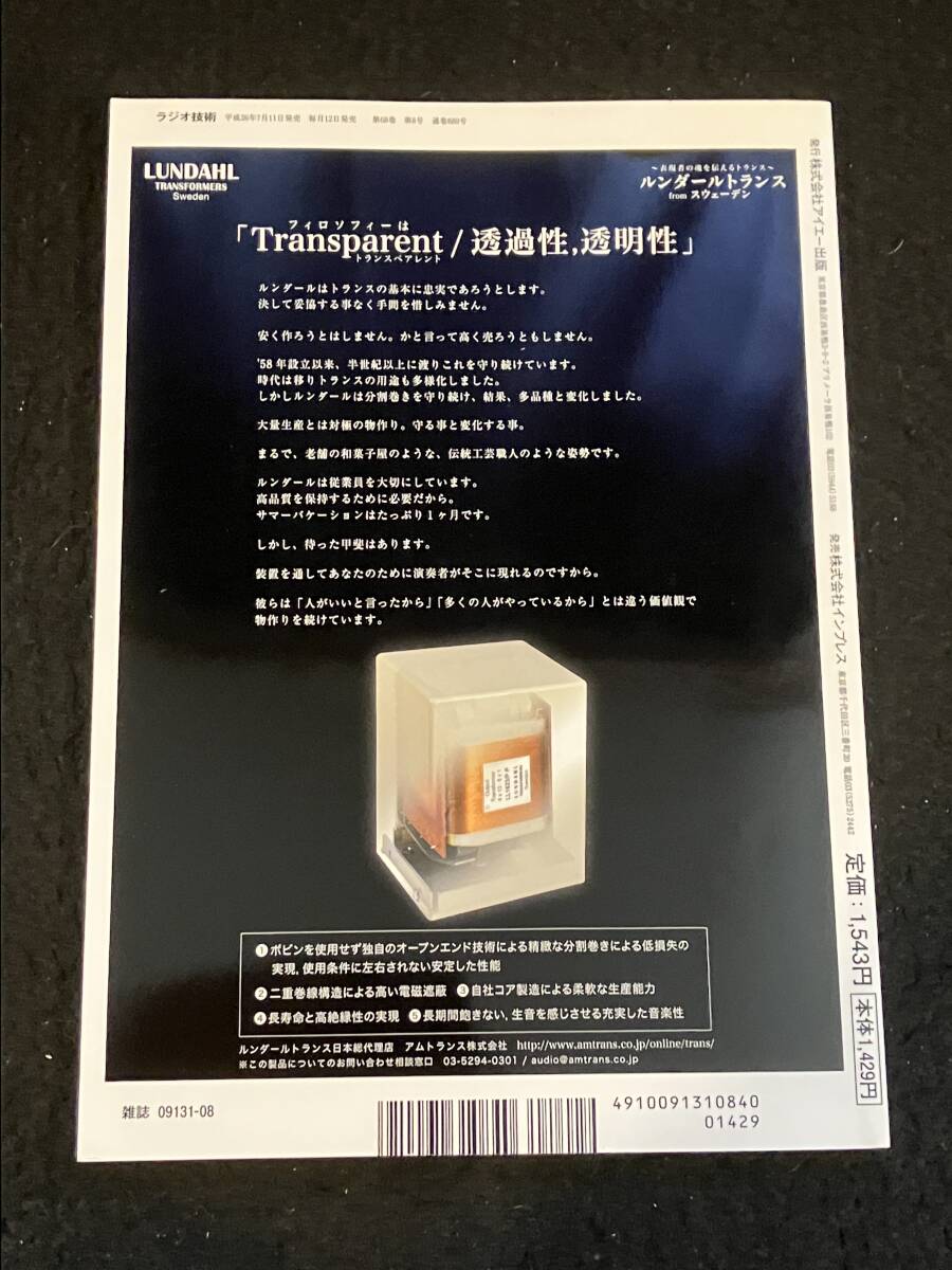 ラジオ技術 2014年8月号/アイエー出版 ◆PX4s/845PP/9パラMUSESオペ・パワー・アンプ ■製作特集■ ★PX4シングル・パワー・アンプの製作 ★オペアンプを9コ並列で出力2.6W ・“パラレル・ワールド”アンプを作る ★845 A級プッシュプル・パワー・アンプの製作 ★センター・チャンネル・システムもマルチ化する ・5.1chサラウンド用センター・システムの重要性(完) ★KT66PPパワー・アンプの試作(その3) ★本格的オーディオ・システムの構築へ向けて ・(25)上下動防振機構を作る(6) ★実験:トランジスタ・アンプ設計講座 ・SRPP回路のシミュレーション ★真空管なんて使ったことないけどやってみたら音が出るじゃん的 ・短期連載企画 タマプロ 破 ★最新真空管情報 ・ロシア製のショート・プレート型12AX7系について(前篇) ~Voskhod-12AX7VKA~ ■スクランブル・レポート■ ■第18回「RGAAクラブ-音の展覧会」出展作品 ①後面波を積極的に生かした吊り下げ式SPシステム ②背面音の影響を避ける6角柱スピーカの試作 ★日本オーディオ協会から発表された ・「ハイレゾ」の定義は24bit/96kHz以上 ★ダイナミック・レンジは広い方がよいか? ★コンサートホールの音を訪ねて(20) ・永田穂氏:ホールの理想とは? ★実践生録テクニック:第230回 ・ゼンハイザーMK4コンデンサ・マイク初使用 ★連載:私のレコード遍歴 ・名盤・珍盤・迷盤・掘り出し盤etc. ★クロストーク ①2チャンネルSPで3次元音場再現-その後 ②TL-Mg型MCを作ってみました ★復刻シリーズ ・逆立ち方式単段MOS-FETアンプの製作(2)(1999年12月号より) 【状態】 中古本です。「 良い 」程度です。(ほぼ新品・非常に良い・良い・並) 表紙に少しスレ・ヨレ等がございます。その他は目立つイタミはなく概ね良好です。 【発送方法】 ■荷造送料:250円(追跡番号付き。) ※クリックポスト等での発送を予定しております。 ※輸送中の事故保証はつきません。 ※当方指定以外の発送方法又は局留め・センター留めをご希望の方は送料が変わる場合がございます。 【 注意事項 】 ※全体的なコンディションや内容につきましては画像にてご判断お願いいたします。 ※撮影環境やご使用のモニターの設定上、実物と多少色が異なる場合があります。 ※写真に掲載されているものが全てです。ふろく等写真に掲載されていないものはございません。 以上、ご入札の際は上記の件ご理解、ご了承のうえご入札お願い致します。 ◇◆必ずお読み下さい◆◇ 『休日及び出荷停止日のお知らせ、評価についてのお知らせ、取引時のメールについてのお知らせ』等の連絡事項が自己紹介欄に記載されていますので、入札の前にご確認願いします。 | ||||