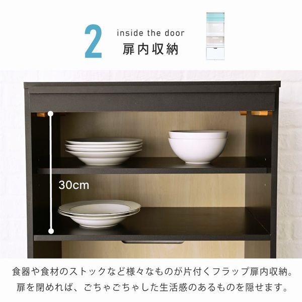 さりげないツートーンが印象的なキッチンシリーズRegal。 コンパクトながらもオープンラックやスライド収納、フラップ扉に引き出し収納など、豊富な収納を備えた機能的なレンジ台です。 引き出しは2Lのペットボトルも入るサイズ設計。 |