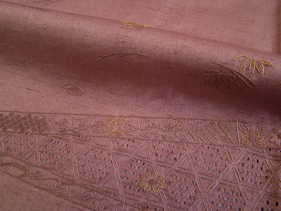| ちょっと一言 | 洒落帯で粋に〆たい存在感溢れる汕頭刺繍入りの豪華な総刺繍の美しい真綿紬の訪問着です。 帯や小物次第で様々なコーディネートをお愉しみ頂ける事と思います。 |