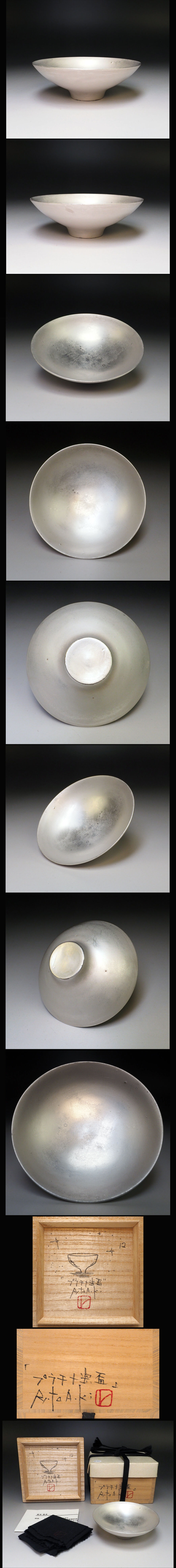 ![]() 青木良太のきれいな釉薬の「プラチナ瓷盃」です。 サイズ:約 径 9.1cm 高 3.0cm 共箱・共布・栞つき 作品状態:表面のスレ傷がありますが、欠損は無く美品です。(目視確認です。) こちらの作品は真作保証の安心頂ける作品であることをお約束いたします。 不明な点は、入札前に質問等でご確認下さい。 青木良太 1978年 富山県に生まれる。 2002年 岐阜県多治見市陶磁器意匠研究所卒業。同年、岐阜県土岐市にスタジオ開設。 2002年 テーブルウェアフェスティバル最優秀賞・東京都知事賞?朝日現代クラフト展奨励賞。 2003年 高岡クラフト展銀賞。 2004年 Sidney Myer Found International Ceramics Award銀賞。 2005年 高岡クラフト展グランプリ?International Triennial of Silicate Arts 銀賞 2006年 テーブルウェアフェスティバルグランプリ。 2007年 4th World Ceramic Biennale 2007 Korea銀賞。 2008年 台湾国際陶芸ビエンナーレ特別賞。 | |||