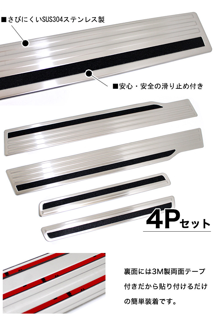 | 車種専用設計で取付け楽々! 安心安全の滑り止め付で乗り降りも問題なし。 ドレスアップ効果抜群のアイテムです! ■適合 ・ステップワゴン RP1 / RP2 ・ステップワゴン スパーダ RP3 / RP4 ■年式:H27/4〜 ■サビに強いSUS304ステンレス製&滑り止め付 ■両面テープ装着済み ■セット内容:スカッフプレート 4P |
