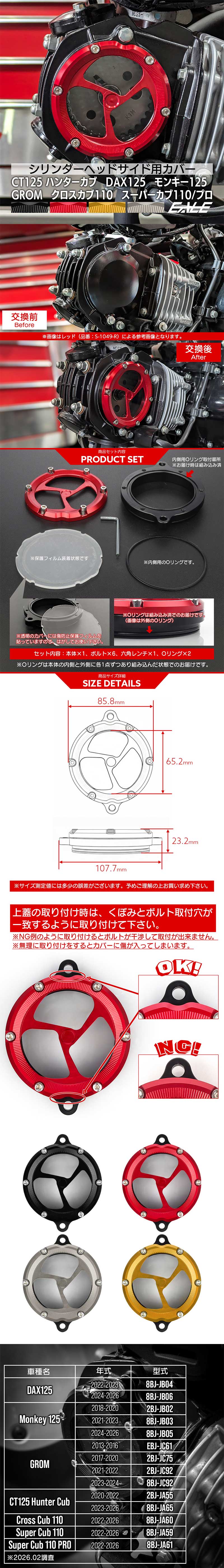 純正のシリンダーヘッドサイドカバーを外して本品に交換するだけでイメージチェンジ。 アルミを丁寧に削り出し加工された本品は、所有欲も満たす高級感のある仕上がりに。 ミック好きにうれしいスケルトン仕様です。 ■他のカラーは⇒ こちら | ■ シリンダーヘッドサイドカバー ■ 材質:アルミニウム ■ 適合車種 画像内に記載 ■ カラー:ブラック ■ 入数:数量1で1個 | |