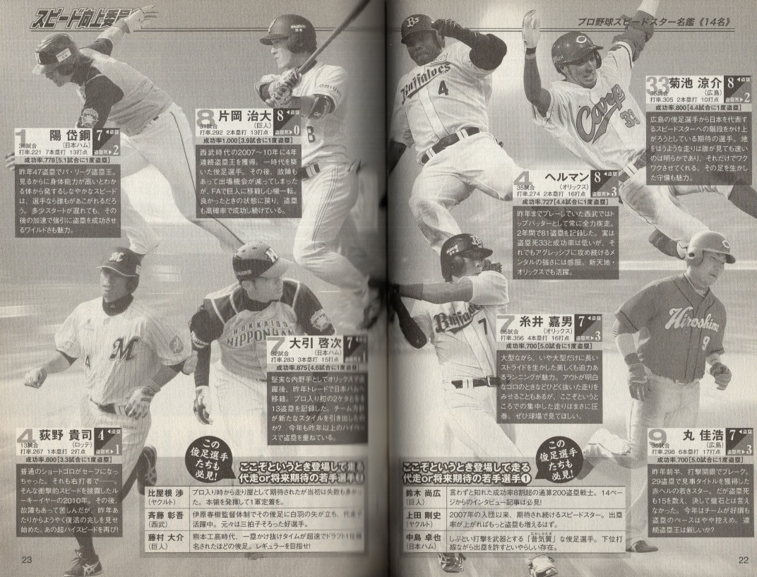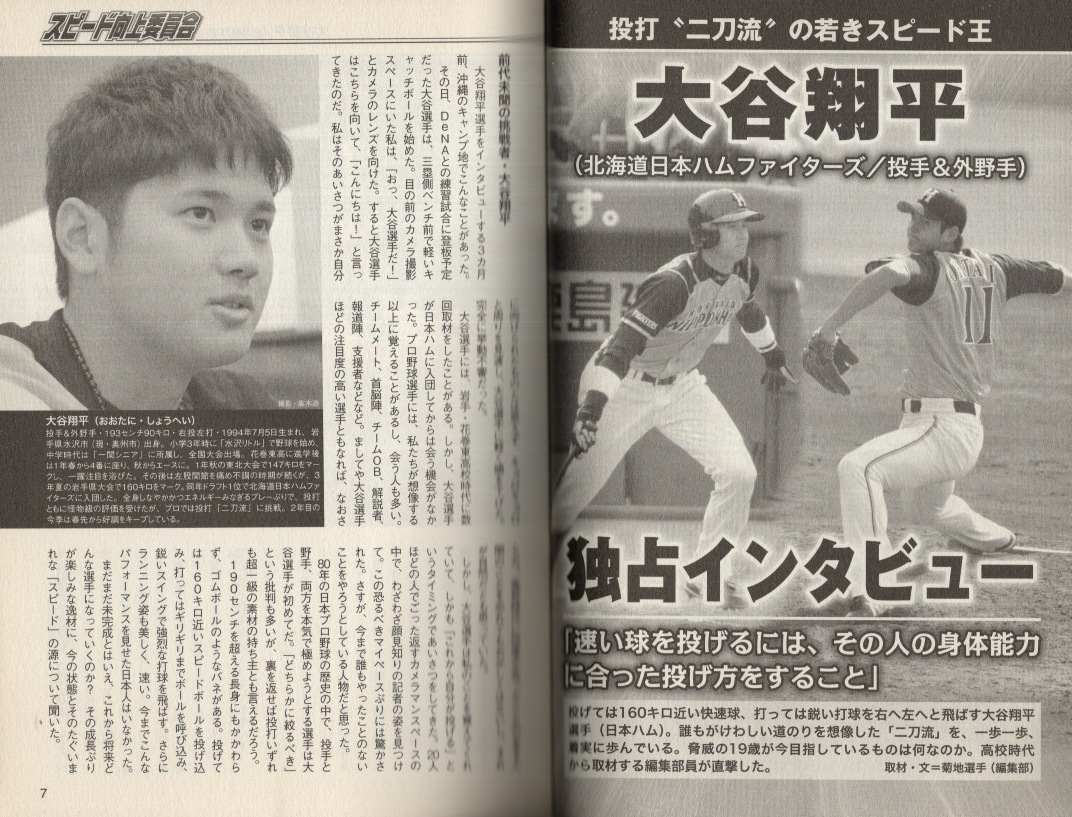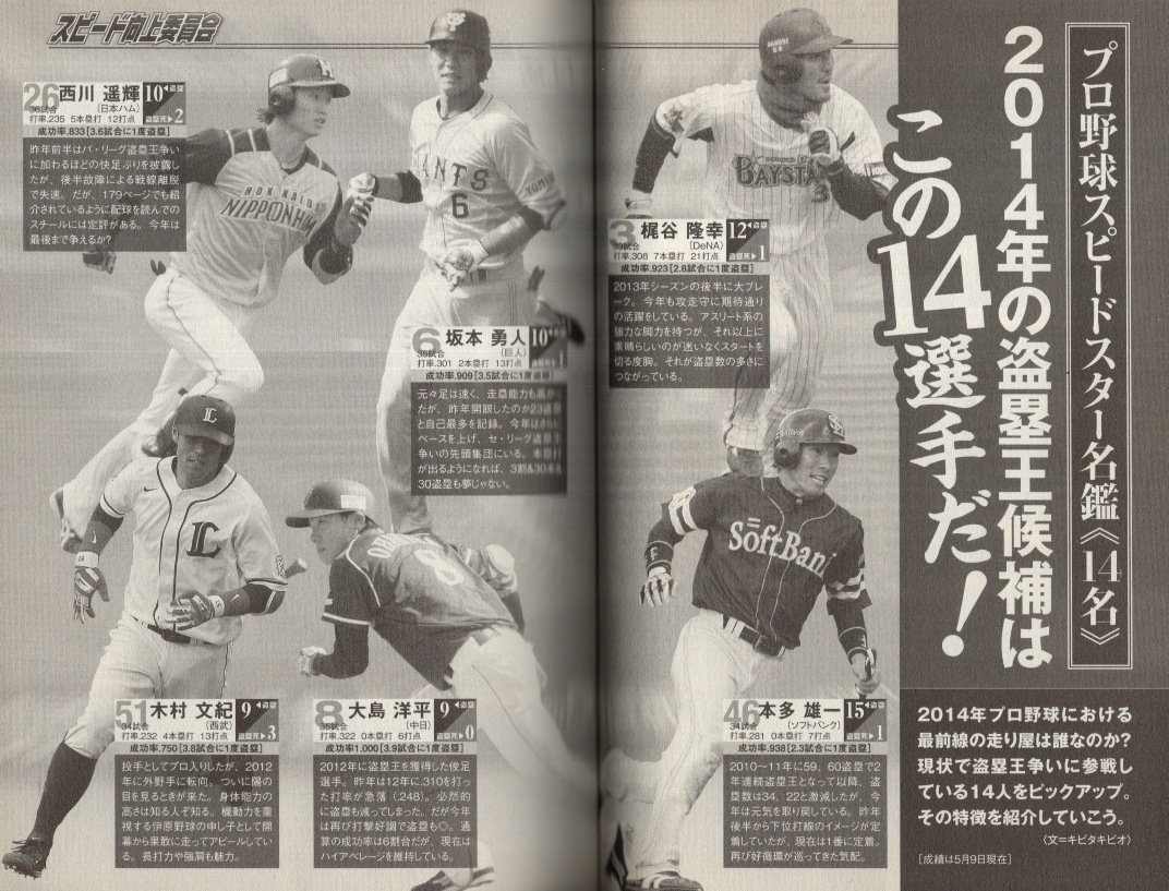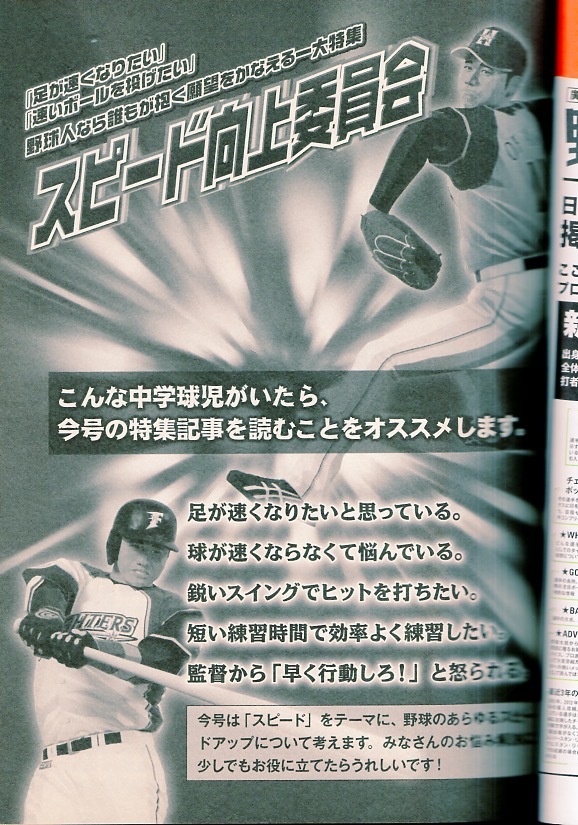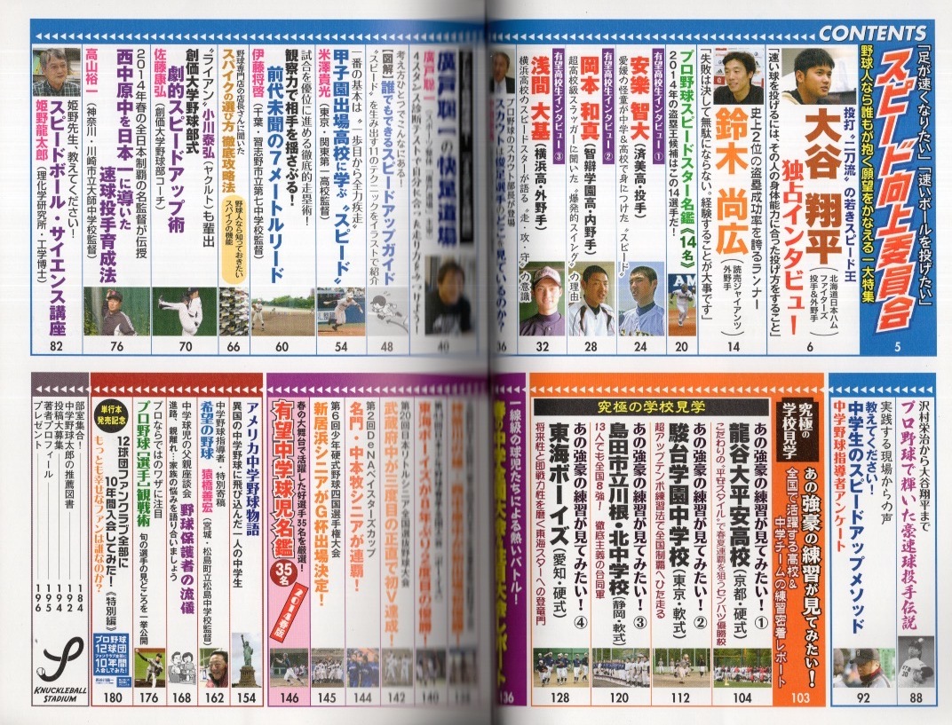 | ◎特集:スピード向上委員会 「足が速くなりたい」「速いボールを投げたい」 野球人なら誰もが抱く願望をかなえる一大特集 投打“二刀流"の若きスピード王 大谷翔平(北海道日本ハムファイターズ/投手&外野手)独占インタビュー 史上2位の盗塁成功率を誇るランナー 鈴木尚広(読売ジャイアンツ/外野手) プロ野球スピードスター名鑑《14名》 2014年の盗塁王候補はこの14選手だ! 安樂智大(済美高・投手) 愛媛の怪童が中学&高校で身につけた“スピード" 岡本和真(智辯学園高・内野手) 超高校級スラッガーに聞いた“爆発的スイング"の理由 浅間大基(横浜高・外野手) 横浜高校のスピードスターが語る“走・攻・守"の意識 中田宗男(中日ドラゴンズ・スカウト部長) スカウトは俊足選手のどこを見ているのか? テレビで話題沸騰! 「4スタンス理論」 廣戸聡一(スポーツ整体「廣戸道場」主宰)の快足道場 誰でもできるスピードアップガイド “スピード"を生み出す11のテクニックを図解で紹介 甲子園出場高校に学ぶ“スピード" 米澤貴光(東京・関東第一高校監督) 観察力で相手を揺さぶる! 前代未聞の7メートルリード 伊藤将啓(千葉・習志野市立第七中学校監督) 野球専門店の店長さんに聞いた スパイクの選び方 徹底攻略法 “ライアン"小川泰弘(ヤクルト)も輩出 創価大学野球部式 劇的スピードアップ術 佐藤康弘(創価大学野球部コーチ) 2014年春全日本制覇の名監督が伝授 西中原中を日本一に導いた速球投手育成法 高山裕一(神奈川・川崎市立大師中学校監督) スピードボール・サイエンス講座 姫野龍太郎(理化学研究所・教授) 沢村栄治から大谷翔平まで プロ野球で輝いた豪速球投手伝説 教えてください! 中学生のスピードアップメソッド 中学野球指導者アンケート 究極の学校見学 あの強豪の練習が見てみたい! 全国で活躍する高校&中学チームの練習密着レポート 龍谷大平安高校(京都・硬式) 駿台学園中学(東京・軟式) 島田市立川根・北中(静岡・軟式) 東海ボーイズ(愛知・硬式) 春の中学全国大会&注目大会レポート 第5回 全日本少年春季軟式野球大会 第44回 日本少年野球春季全国大会(ボーイズ) 第20回 日本リトルシニア全国選抜野球大会 第2回 DeNAベイスターズカップ 第6回 少年硬式野球四国選手権大会 有望中学球児名鑑《35名》2014春版 春の全国大会で活躍した35名を厳選! アメリカ中学野球物語 異国の中学野球に飛び込んだ一人の中学生 中学野球指導者・特別寄稿 希望の野球 猿橋善宏(宮城・松島町立松島中学校監督) 中学球児の父親座談会 プロ野球[選手]観戦術 プロならではのワザに注目、旬の選手の見どころを一挙公開 単行本発売記念・12球団ファンクラブ全部に10年間入会してみた! 《特別編》 部室集合! 中学野球太郎の推薦図書 | |||