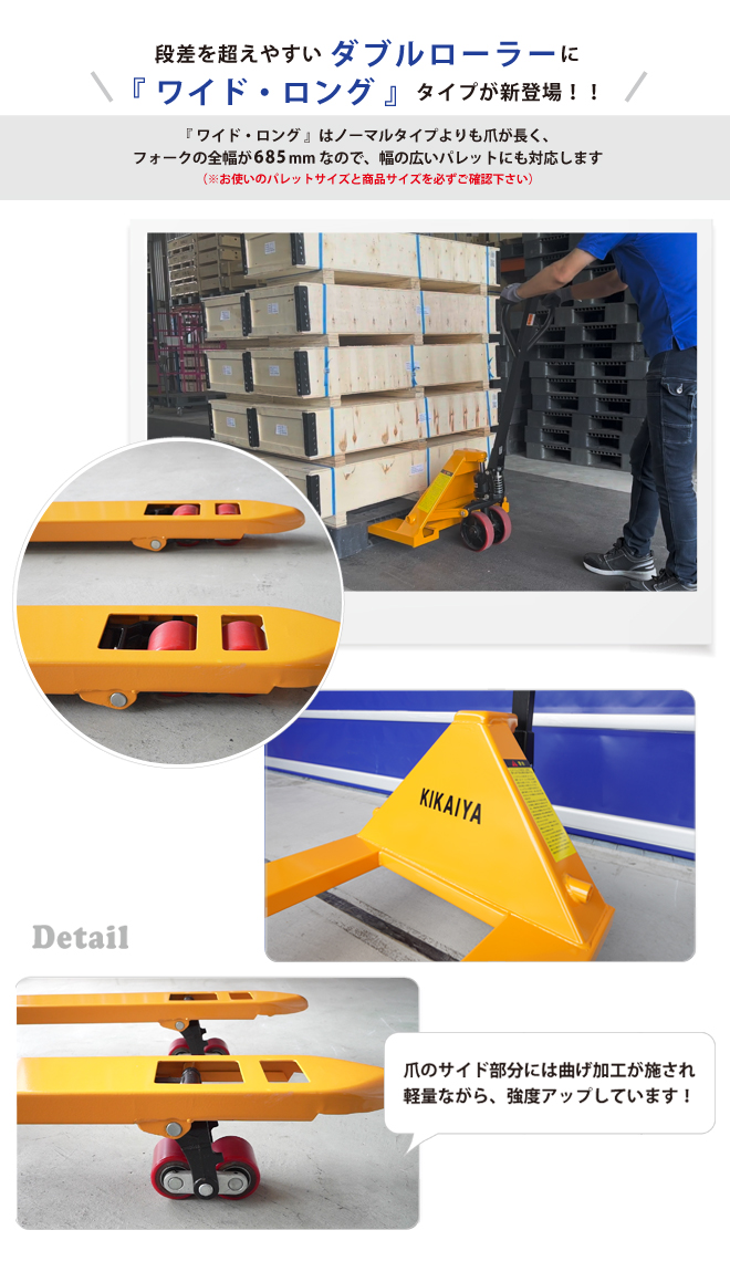 ●人気のダブルローラーにワイド・ロングタイプが登場! ●フォークローラーはダブルローラーなのでシングルローラーに比べて段差を越え易く、重い荷物でも動き易くなっています ●ローラー軸は全てベアリング入りで移動が楽々!! ●ワイド・ロングタイプは通常より爪が長く、フォーク幅が685mmと幅広なので安定感があります ●ハンドルは樹脂グリップ巻きでにぎり易く、冬場につめたさが手に伝わりません ●ステアリング/フォークローラーともウレタン巻き(ベアリング入り)で静かに転がり、床にも優しく傷付きの心配が有りません ●強度アップの為、爪のサイド部分には曲げ加工が施されています ●工業製品国際規格GS/TUV/CEマーク全て取得の一級品です |