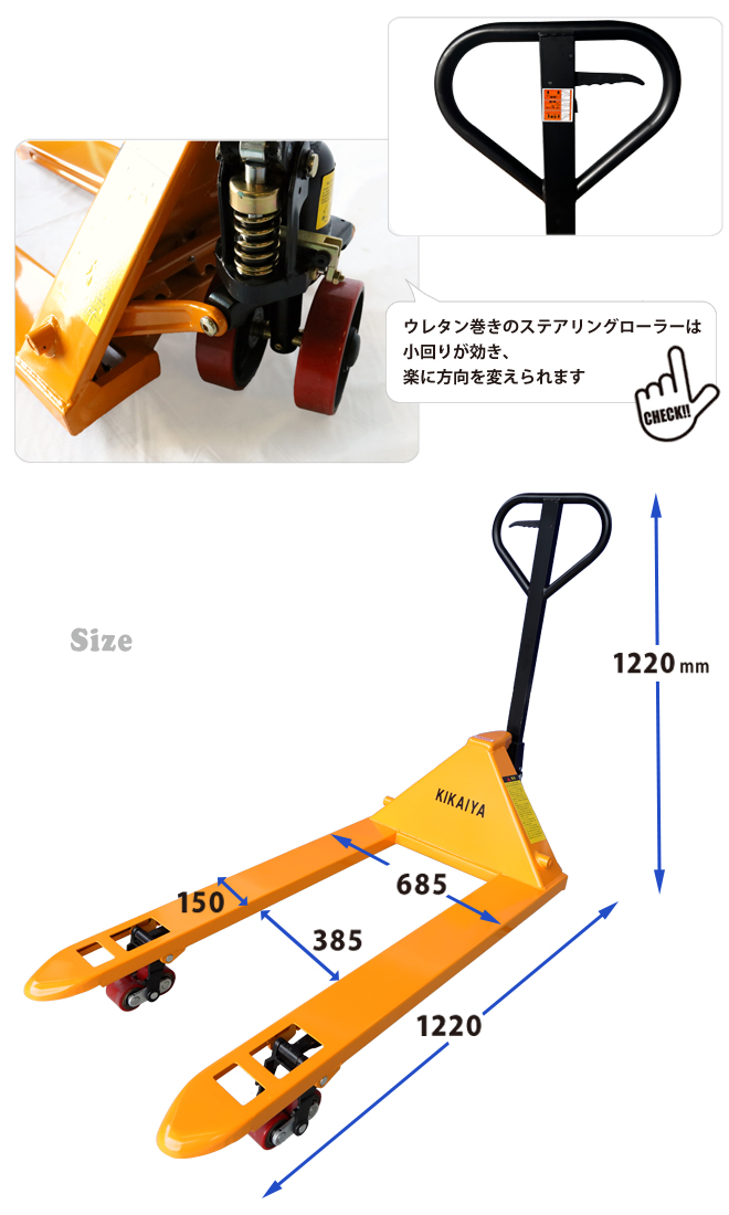 | サイズ | ・全長 1610mm ・フォーク長さ 1220mm ・フォーク全幅 685mm ・フォーク爪幅 150mm ・フォーク間 385mm ・フォーク最高/最低高さ=190/75mm |