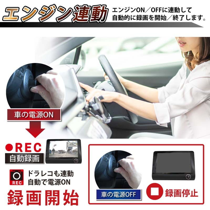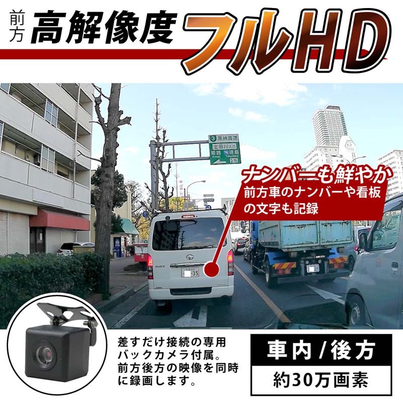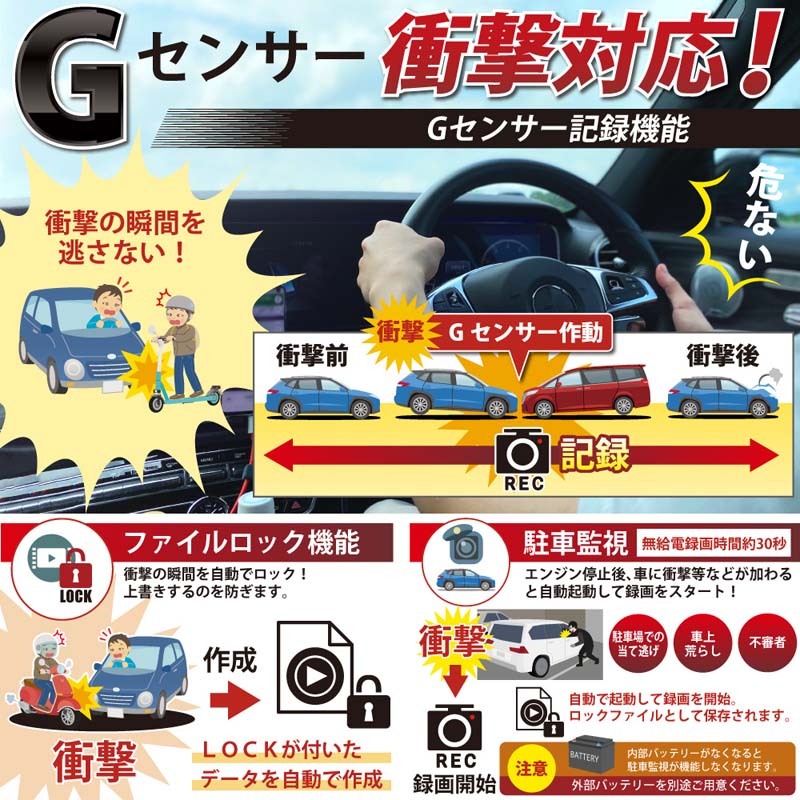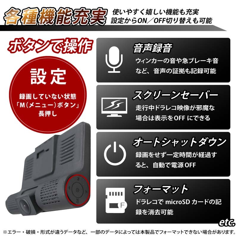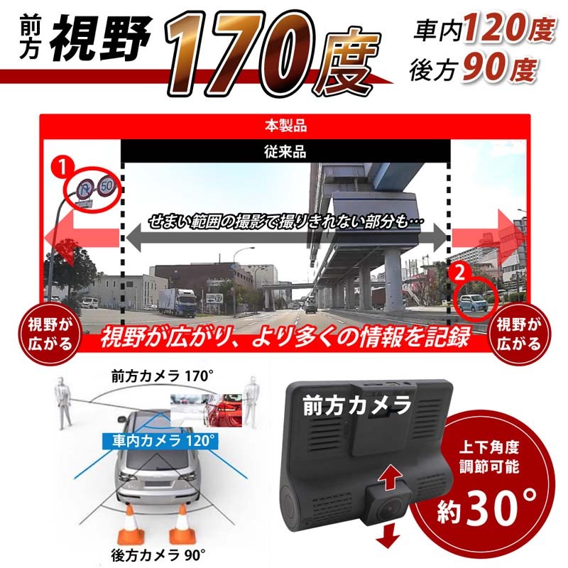 | 商品紹介 【製品サイズ】 本体:縦幅8.0×横幅11.8×厚さ3.2cm モニターサイズ:4インチ リアカメラ:横幅2.1×縦幅2.1×厚さ2.1cm ※シガーソケットコード全長約3.4m ※リアカメラ(計約6mケーブル:本体約0.5m、約5.5mケーブル付) フロントカメラ:約170度、1080P/720P 室内カメラ:約120度,VGA バックカメラ:約90度,VGA LCD:4インチ TFT800×480 音声録音:有 バッテリー:180mAh 電源:DC5V 静止画:最大12M/JPG 駐車監視:ON/OFF 衝撃により録画開始 衝撃検知:高/中/低※衝撃を感知すると自動録画します。 自動電源OFF:OFF/3分/5分/10分 HDR:ON/OFF ※画像の明暗差を際立たせ視覚効果を高めます。 使用環境:温度0~60℃,湿度10~80% 【動画仕様】 サイクル録画:OFF/3分/5分/10分 ※ファイルを指定時間で分割して古い物から削除しながら録画します。 カメラ選択:前方+後方,前方+室内 キー操作音:ON/OFF 言語設定:日本語他 周波数:50Hz/60Hz 【写真仕様】 撮影モード:単撮影/2秒/5秒/10秒/(セルフタイマー) 撮影方式:1回 解像度:12M/JPG 連写:ON/OFF 画質:ファイン/ノーマル/エコノミー 効果:ストロング/ノーマル/ソフト ISO:自動/100/200/400 ホワイトバランス:自動/デイライト/曇り/電球/蛍光灯/ 時刻表示:ON/OFF 【製品サイズ】 本体:縦約8.0×横約11.8×厚さ約3.2(cm) 重さ約82g バックカメラ:横約2.1×縦約2.1×厚さ約2.1(cm) 重さ約20g ※シガーソケットコード全長約3.4m ※バックカメラ(計約6mケーブル:本体約0.5m、約5.5mケーブル付) 【内容品】 本体/リアカメラ/リアカメラケーブル約5.5m/両面テープ(リアカメラ用)/スタンド/シガー電源アダプター(約3.4mケーブル付)/32GBmicroSDカード/取扱説明書兼保証書 【録画時間】※フルHD(最高画質),3カメラ同時録画の場合。あくまで目安です。 8GB:約20分 16GB:約40分 32GB:約80分 HD画質で録画された場合、録画時間は約2倍になります。 ※本製品にお使いいただけるSDカードのスペックは、容量8~32GBまで、スピードクラス10を推奨しております。 スペックを満たしていないカードでは、正常に作動しない場合がございます。予めご了承ください。 市販されているSDカードの一部ではスピードクラス10でもドライブレコーダーに対応できないスペックの物が出回っております。 そちらのSDカードを使用される場合、正常に認識されなかったり、エラーが出る場合がございます。 当店で動作検証済にて販売させていただいているSDカードや、 ソニー、サンディスクさまや東芝の正規メーカー品の使用を推奨させていただいております。 上記推奨SDカード以外のご使用が起因する不具合は弊社製品の不具合ではない為、保証対応できかねます。 ドライブレコーダーは運転状況や交通事故を客観的に記録することを目的とした機器ですが、 全てを記録できることを保証した製品ではありません。 ※MicroSDの種類によって相性が出る場合がございます。 ※本製品に限らずほとんどのドライブレコーダーは、作動時にノイズを発生させます。 ノイズの影響により車内の各電子機器(オーディオ、カーナビゲーション、テレビ、キーレス、ETC など)が誤作動を起こすことがあります。 本製品の設置は、アンテナや電子機器より遠ざけるか、市販のノイズ対策用品を取り付けてください(フェライトコア、電磁波吸収シートなど)。 なお、対策を講じても確実にノイズを防止できるものではありませんので、ご了承ください。 アイドリングストップ機能搭載車やハイブリッド車(一部)などは、省電力モードやエコ機能が搭載されているため、内部電源稼働形式は異なります。そのため、場合によっては本製品がうまく稼働しない場合があります。これは、本製品の不良ではありませんのであらかじめご了承ください。 万が一、映像が記録されなかった場合や、記録したデータが破損したなどの場合についての責任は、弊社では一切責任を負いかねます。 以下のケースなどでデータが記録されない場合があります。 本体が作動していなかった場合 Micro SDカードが挿入されていなかった場合 大きな事故で本体が破壊された場合 記録中にMicro SDカードが抜けてしまった場合 正常使用外の使用時データが上書きされてしまった場合 本製品は、事故の検証に役立つことも目的の一つとした製品ですが、 完全な証拠としての効力を保証するものではありません。 これらの場合については弊社は一切責任を負いません。 安全上の注意 本製品を、前方の視界を妨げる場所や、ステアリング、シフトレバー、 ブレーキペダルなどの運転操作を妨げる場所など運転に支障をきたす場所、 同乗者に危険を及ぼす場所などには絶対に取り付けないでください。 交通事故やけがの原因となります。 カメラは、運転者の視界の妨げにならないよう、 フロントガラス上部に設置して下さい。 運転者は走行中に操作しないでください。 前方不注意となり事故の原因となります。 必ず安全な場所に車を停車させてから行ってください。 ※付属のシガーDCアダプターは12/24Vの電圧をドライブレコーダーの使用電圧5Vに変圧できます。 付属のシガーDCアダプ