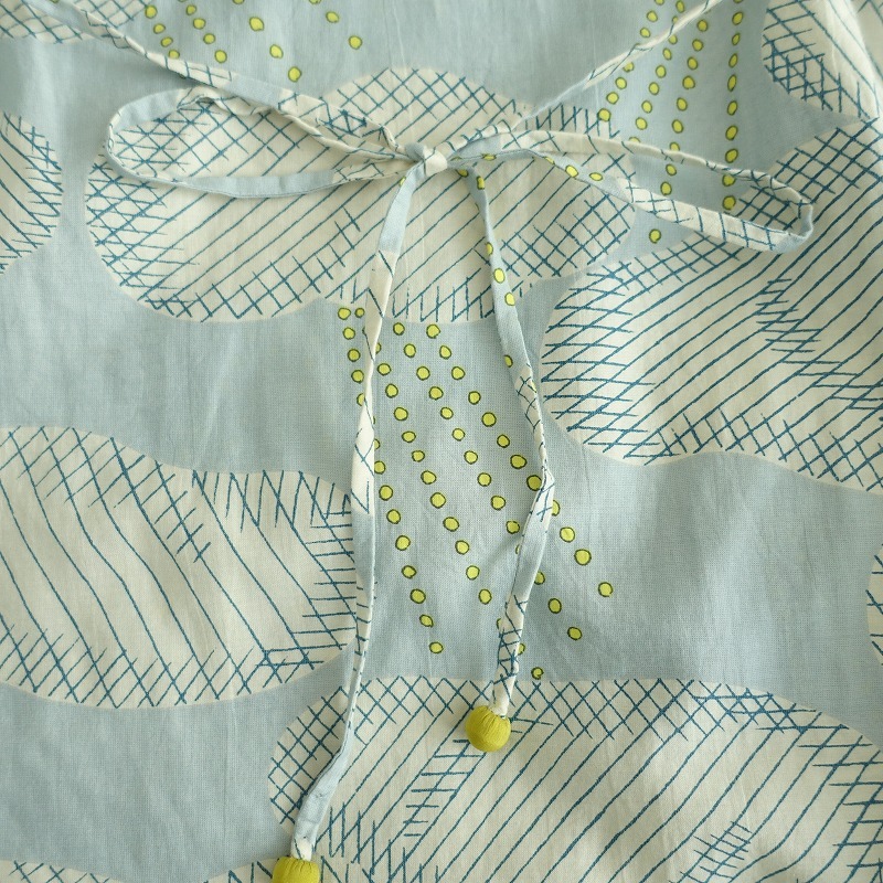 | mina perhonenの「after rain」コットンシルクプリントワンピースです。カラーは白・水色・青・黄色です。コットンと汁期の薄手生地を使用。透け感がございます。背部1ボタン開きのプルオーバードレスです。マスタードカラーのパイピングを配したネックラインと、袖口にギャザーがあしらわれております。ウエストは共布のベルトループ&着脱可能の腰紐付きです。両サイドにシームポケットがございます。定価(メーカー希望小売価格)79,200円の商品です。 |