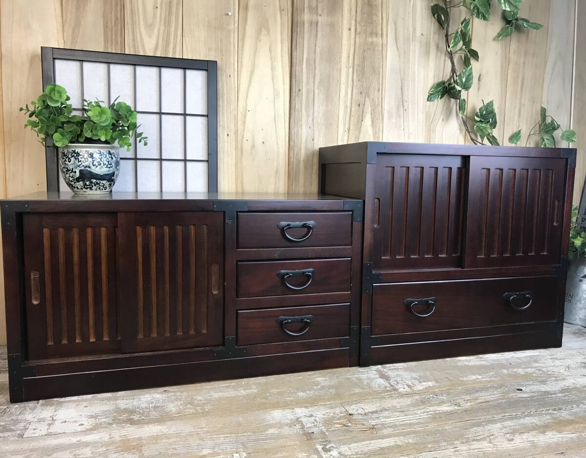 ◆◇商品詳細◇◆ 民芸家具和引き戸付きチェスト二点 民芸調の落ち着きのある素敵な和箪笥です。どこか懐かしい和の温かみがあるお品。材質は桐材を使用しているため手触りが柔らかく、調湿性・耐火性・防虫性に優れています。変形などもなく長年愛用していただけます。桐材なので軽くて持ち運び、移動など楽々です。古き良き時代を思い出させるデザインで和室、アジアンインテリアにぴったりです。黒塗りの金具が高級感があり、お部屋に置くだけで存在感抜群!お色は飽きのこない濃い目のブラウンで重厚感を演出しています!人気商品が今だけこの価格!他では買えない民芸商品をぜひこの機会に。二点セットの価格です。 【商品状態説明】 小キズあり、まずまずの美品。 完成品になります。 こちらの商品は、現品画像ではありません。未開封の在庫の中から丁寧に検品後、発送いたします。 【サイズ】横長タイプ 横幅:75㎝ 奥行:35㎝ 高さ:41㎝ 引き出し内寸:25cm×30cm×6cm 引き戸内内寸:40cm×30cm×30cm 【サイズ】四角型タイプ 横幅:60㎝ 奥行:35㎝高さ:54㎝ 引き出し内寸:51cm×31cm×11cm 引き戸内寸:57cm×31cm×28cm 【素材】 桐材無垢 【カラー】 ブラウン 【参考価格】 ¥19,000 | ◆◇発送方法◇◆ ●送料は基本無料ですが、沖縄・離島などにお住まいの方はご負担ください。 (沖縄・離島の方はメールにてご連絡いただければ、送料をお知らせいたします。) ●ヤマト運輸・佐川急便・第一貨物のいずれかにて配送いたします。 (運送会社の指定はできません。ご了承ください。) ●日時・時間指定のある方や、お問い合わせ(追跡)番号をご希望の方は取引連絡の際にお知らせください。 | |