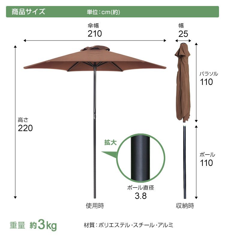 \ レジャー、お庭でのバーベキュー時の日差しよけにピッタリ! / ひもをを引っ張ることで、パラソルの開閉がラクにできます! UVカットが施された210cmサイズのパラソルが強い日差しから守ってくれるので、 直射日光を気にせず快適にガーデンライフを楽しんでいただけます! 撥水加工も施してあるので、急な雨にも安心です。 アルミ製支柱なので木製パラソルと比較して軽量! ご自宅のお庭、バルコニー、テラスや店舗先のカフェペースなどにお使いいただけます。 河原でのバーベキュー、夏場にお子様のプール遊びの時にご使用になっているお客様もいらっしゃいますよ♪ ■商品コード: パラソル:ACB001GG ベース:ODTT14A ■商品仕様 (パラソル) カラー:グレージュ 素材:ポリエステル、スチール、アルミ 重量(約):3kg サイズ(約) ・使用時:傘幅210cm×高さ220cm ・収納時(パラソル):110cm×25cm ・収納時(ポール):長さ110cm ・ポール直径:3.8cm (ベース) カラー:ブラック サイズ(約):幅450×奥行450×高さ270cm 重量(約):1.5kg 水を入れた時の重量(約):21.5kg 対応パラソル(約):直径40mm対応 材質:ポリエチレン他 ■注意事項 ・傘生地には撥水加工をしておりますが、完全防水ではありません。 ・風や雨が強い日の使用は危険ですので、ご使用しないでください。 パラソルやベースを地面に固定しても突風や瞬間的な豪雨などでパラソルが破損する場合がございます。 そのような自然現象による破損につきましては保証の対象外となりますのでご注意ください。 ・パラソルはテーブルにさすなどパラソル支柱の中間を固定していただきご使用をしていただくことを推奨いたします。 ・商品は、モニターによって色合いが異なって見える場合があります。 ・仕様・デザインは改良のため予告なく変更することがあります。 ■保障期間 7日間 ※商品到着後7日以内の初期不良・破損のみご対応させていただきます。 【新品未使用品です】 |