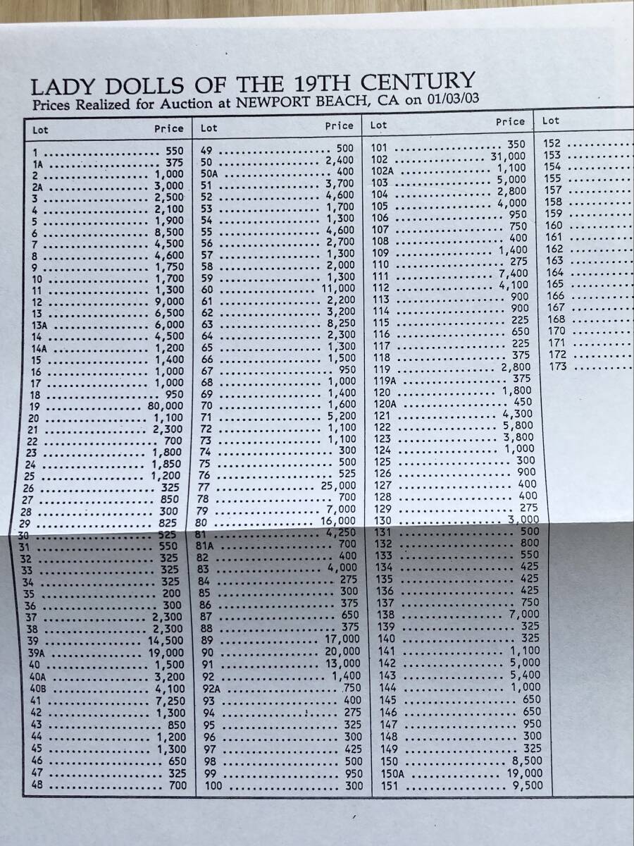 19世紀の淑女の人形と衣装についての解説本。 数百点掲載されており、 カラーの写真が豊富な見ごたえのある1冊です。 2003年1月3日に開催された オークションの落札価格表付き。 本棚に眠っていた中古の本です。 長期保管品につき経年劣化による 汚れ・ヤケ・擦傷等あります。 画像をしっかりご確認できる方、 中古品やデッドストックに慣れている方におすすめ size 縦27.5cm×横20cm 素人の計測ですので、大まかです。 ご質問はお気軽にどうぞ* |