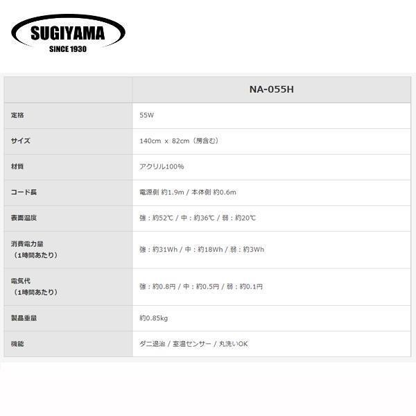 【杉山紡織 電気ひざ掛け NA055H】| ■□商品特長□■ | ◎丸洗いOK! 洗えるひざ掛けです。 ◎ダニ退治機能付き。 ◎室温の変化を感知し、ひざ掛けの温度を自動調整する「室温センサー」付き。 ◎信頼の日本製です。 |