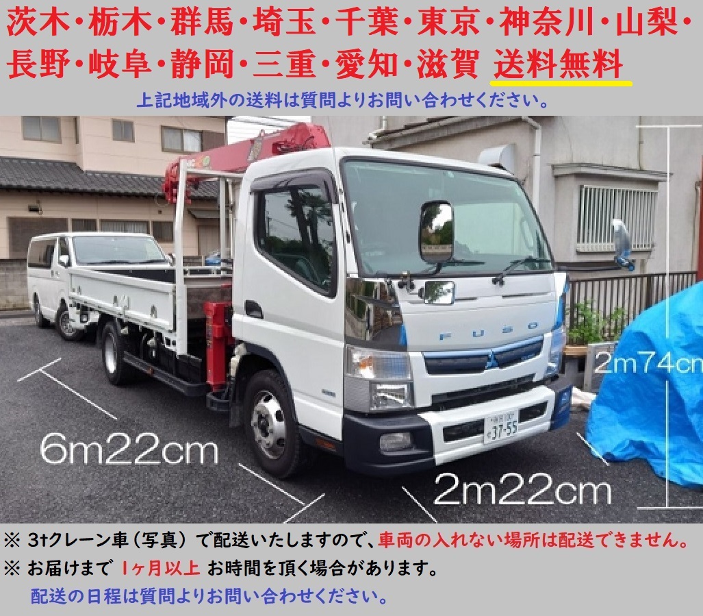 | 商品引き渡し | ① 茨木・栃木・群馬・埼玉・千葉・ 東京・神奈川・山梨・長野・岐阜・静岡・三重・愛知・滋賀 送料無料 ↓ 配送条件があります。必ずお読みください。↓ ★日程・スケジュール★ ①日付・時間指定はできません。 配送日は月曜日~金曜日の平日に限ります。 ②お届けまで1ヶ月以上お時間を頂く場合があります。 合積配送を行っている為ご理解、ご協力をお願い致します。※配送の日程は質問よりお問い合わせください。 ★車両関係★ ① 3t車のクレーン付 で配送いたしますので、 車両の入れない場所は配送できません。 (全長6,220㎜×幅2220㎜×高さ2740㎜) ②クレーンで荷下ろしする為、急な坂道、電線、低い屋根の下など、ドライバーが危険と判断した場合は荷下ろしできません。 ※クレーンが使用できない場所への搬入は基本的にお断りさせて頂いております。 ③山岳地、降雪地域は天候や季節によって配送をお断りする場合があります。 ②上記地域外有料配送 送料は「出品者への質問」からお問い合わせください。 配送条件があります(上記、画像を参照ください) ③ 当社倉庫引取り 【お引取り場所】 〒350-2213 埼玉県鶴ヶ島市脚折1596-1 【引取可能時間】 (月)~(金) 9:00~16:00 ※土日祝 休 ※冬季・夏季休業、GW等の長期休業は倉庫引取も休業となります。 ※商品を手前に出しておくなど準備時間が必要です。 事前に日時をご相談の上ご来社ください。 ※軽トラック、乗用車の積込はお勧めしません。 ※構内が狭い為、4t以上の車両はお受けできません |
