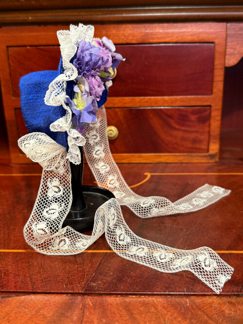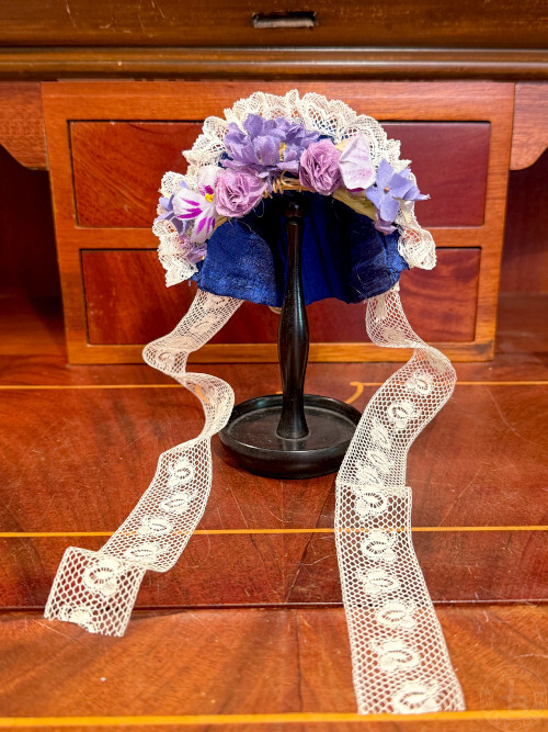 古 いレースを使った手作りドールボンネット シルク ロイヤルブルー 古い素材を使って作られている為、経年による汚れやほつれ等ある場合がございます ※モニター等の都合で実物と色合いが異なる場合がございます ※ハットスタンドは付属しません |