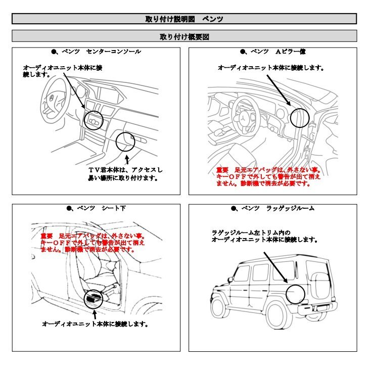 | 商品詳細 | 本製品は、自動識別機能を搭載しています。ロータリースイッチAとBが 0 の位置で接続すると車両を調査し適切なダイヤル位置を設定しメモリーに保存、次回起動時より保存データで起動します。CANの方向(IN/OUT)も適切に切り替え保存ます。 故障状態を内部メモリーに保存する機能があります。動作に問題がある場合に参考になります ※ NAVIは正常に動作・走行中操作可能。 ※ W221 Sクラス / W216 CLクラス のみ TVモードではNAVIが止まります。 【 参考適合車種 】 〇 W177 W176 : Aクラス ( 2013y- ) - 地デジ 〇 W247 W246 : Bクラス ( 2011y- ) - 地デジ 〇 W205 W204 : Cクラス ( 2007y-2021y ) - ※W204はニーエアバッグ付きに限る ( 備考参照 ) 地デジ | アナログ 〇 C118 C117 X117 : CLAクラス ( 2013y- ) - 地デジ 〇 C257 C218 X218 : CLSクラス ( 2011y-2023y ) - 地デジ 〇 W213 W212 C207 C238 : Eクラス ( 2009y-2023y ) - 地デジ 〇 W222 C217 W221 : Sクラス ( 2005y-2020y ) - 地デジ | アナログ ※W221ハンドルボタンの『ON/OFFスイッチ』別売。TVモードではNAVIが止まります。 〇 W216 C216 : CLクラス ( 2006y-2013y ) - 地デジ | アナログ ※ハンドルボタンの『ON/OFFスイッチ』別売。TVモードではNAVIが止まります。 ◇ R231 : SLクラス ( 2011y-2020y ) - 地デジ ◇ R172 : SLKクラス ( 2011y-2016y ) - 地デジ ◇ X290 C190 R190 : AMG・GT ( 2015y- ) - 地デジ ◇ C197 : SLS AMG ( 2009y-2014y ) - 地デジ □ W463A W465 W463 : Gクラス ( 2012.8- ) - 地デジ □ W447 : Vクラス ( 2014y- ) - 地デジ □ X166 : GLクラス ( 2013y-2019y ) - 地デジ □ X156 : GLAクラス ( 2014y-2020y ) - 地デジ □ X247 : GLBクラス ( 2020y- ) - 地デジ □ X253 C253 : GLCクラス ( 2016y-2023y ) - 地デジ □ W167 C167 W166 C292 : GLEクラス ( 2015y- ) - 地デジ □ X204 : GLKクラス ( 2008y-2015y ) - 地デジ | アナログ □ X167 X166 : GLSクラス ( 2016y- ) - 地デジ □ H243 : EQA ( 2021y- ) - 地デジ □ X243 : EQB ( 2021y- ) - 地デジ □ N293 : EQC ( 2018y-2024y ) - 地デジ ※ 『 適合確認 / 在庫確認 』 を必ずご質問欄よりお問い合わせください。 ●『 輸入時期 / 在庫状況 』 等により生産メーカーが異なる場合がございます。 メーカーを気になされる方は、ご購入前に一度お問い合わせください。 ● 品番が多岐に分かれているため、適合品番が 『 複数 』 御座いますので、ご注文前に必ず車台番号にて 【 適合確認 / 在庫確認 】 をお願いいたします。 なお、共通 ( 互換 ) 品番でも不適合の車輛もございますのでご注意ください。 ● 基本的に現品品番及びメーカーの 『 目視確認 』 をお願いいたします。 ● 『 確認事項無し 』 にてご注文の場合、現車品番確認をされたとみなし、納品後の不適合の場合には 『 返品交換不可 』 となります。 ● 画像はサンプルの為、入荷時期により 『 形状変更 ( リプレス ) 』 や 『 素材 / 色味 』 が違う場合がございます。 予めご了承ください。 ● 交換作業に関しては、取付知識ならびに経験豊富な整備工場にて必ずお願いいたします。 |