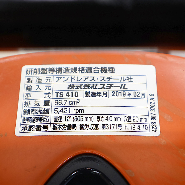 ■メーカー : STIHL(スチール) ■型 式 : TS410 ■全 長 [mm] : 675 ■質 量 [kg] : 9.5 ■ブレード直径 [mm] : 300 ■最大切込み深さ [mm] : 100 ■排気量 [cc] : 66.7 ■出 力 [kW] : 3.2 ■使用燃料油 : 混合ガソリン ■燃料タンク容量 [L] : 0.71 ■メーカー希望価格 : ¥226,000(税別) |