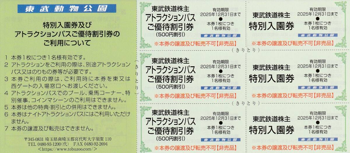 | ●東武動物公園 特別入園券+ライドパスご優待割引券の各3枚セットです。 ●有効期限は2025年12月31日までです。 ●入札価格は入園券+ライドパス割引券各3枚セットの価格です。 ●お支払金額は、落札価格+送料になります。 ●おまけとしまして、KFC・ドトールコーヒーショップお買物優待券3枚+東武商事運営店舗お買物優待券3枚+東武博物館特別入館券(有効期限2025年12月28日まで)3枚をお付けします。 | ||