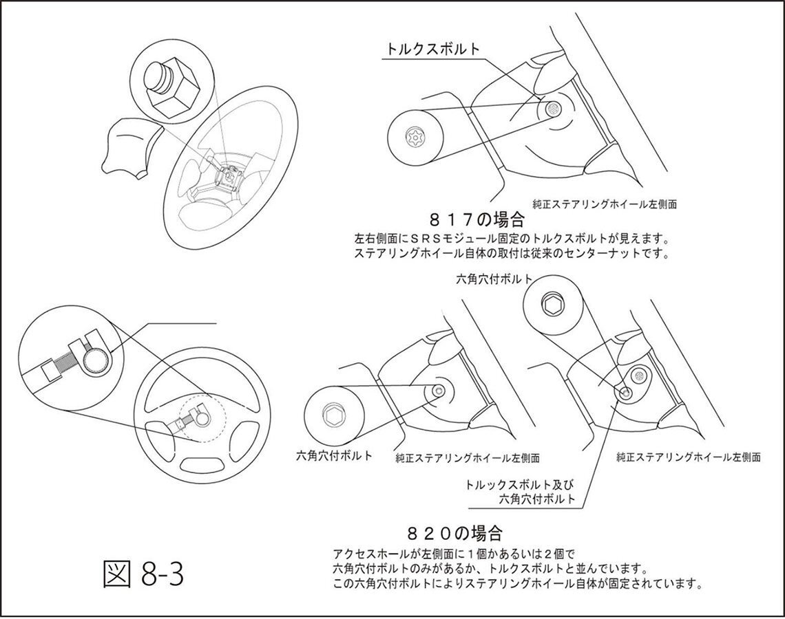 | 適合備考 | ※純正ステアリングの固定方法の違いにより品番が異なります。図を参照して現車確認をしてください。 (図 8-3) ※ボスカバーがスパイラルケーブル(クロックスプリング)に干渉する車両があります。 ボスカバーを歪ませて装着するか、ボスカバーを切断して装着してください。 |