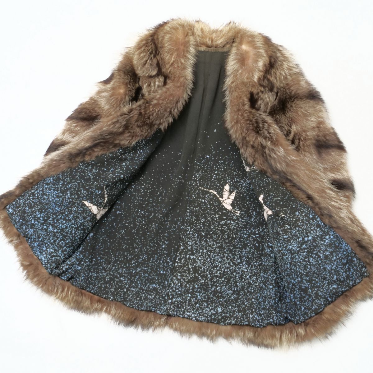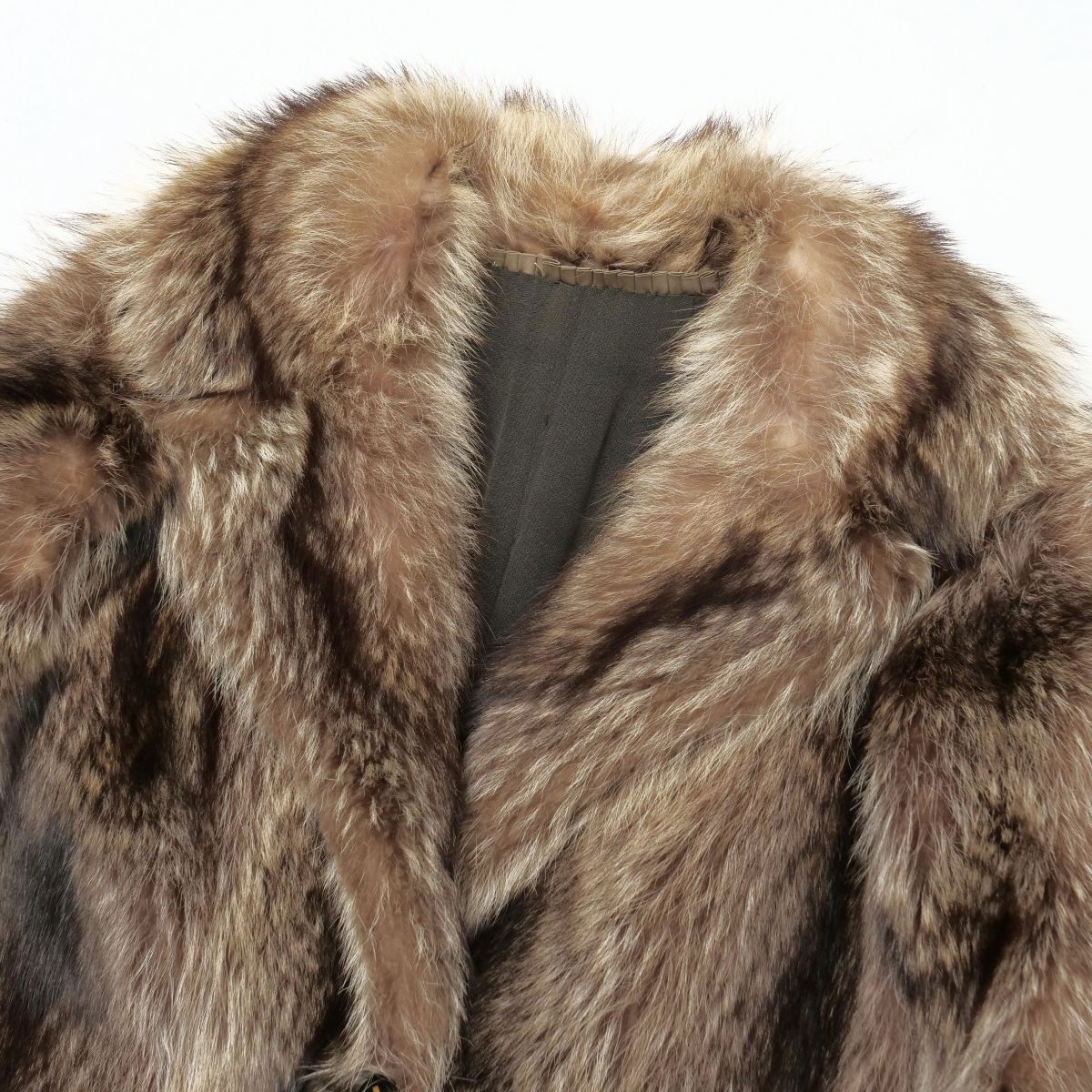 | GS4693◇ラクーン ファーコート 裏:和柄 ミドル丈 毛皮コート ブラウン系 サイズS-M相当 | |||