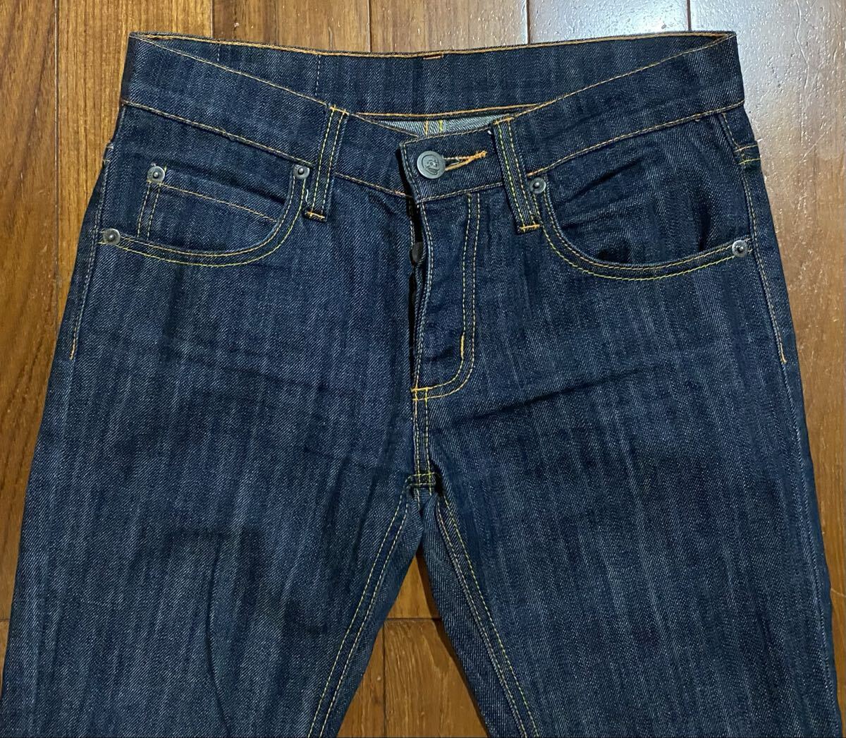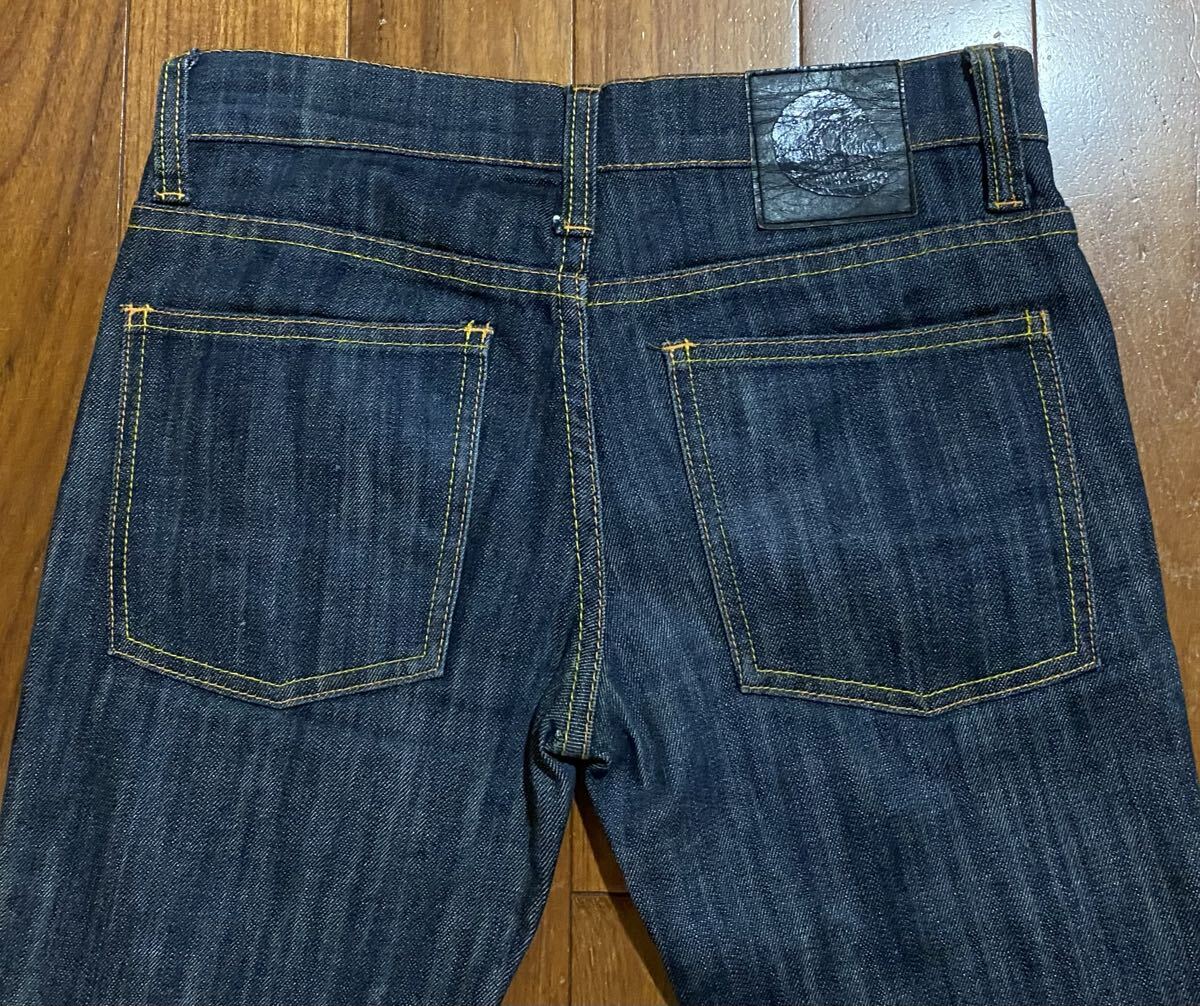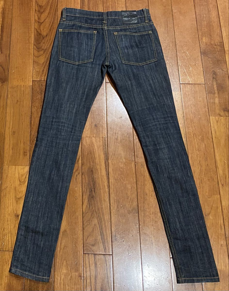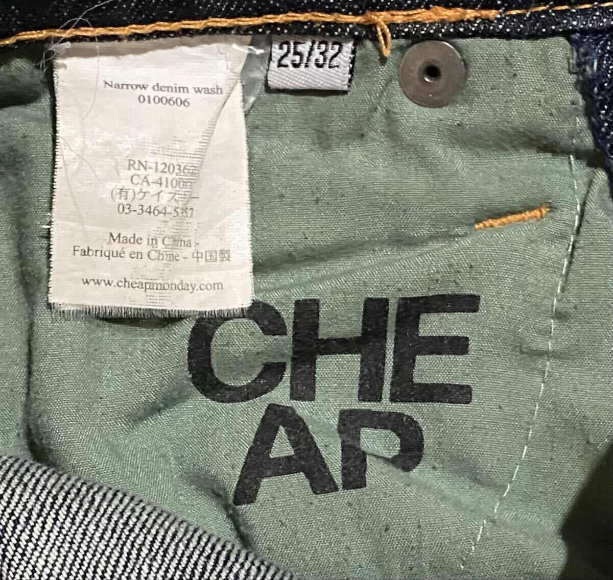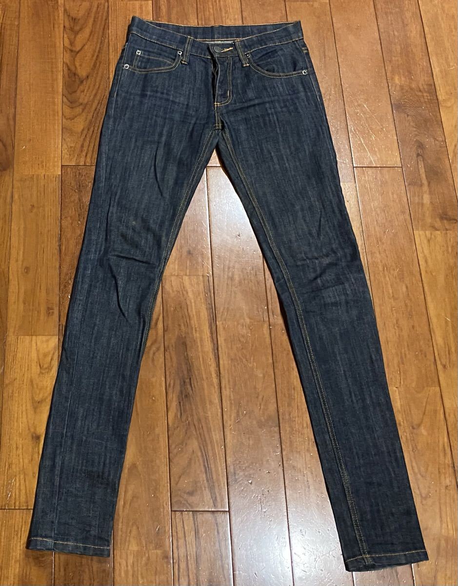 チープマンデーのストレッチスキニーデニム(ジーンズ)、Narrow denim wash 0100606です。色はインディゴブルーです。USEDですが状態は良いです(10段階中8程度)。生地はストレッチ入りで綿99%、ポリウレタン1%です、紙パッチ、ボタンフライです。正規品です((有)ケイスリー、中国製)。サイズはW25×L32でウエストは重ねずに平置きで約69cm、ヒップ約84cm、股上約20cm、股下約80cm、股下15cmのふともも部分約41cm、裾まわり約25cm、重量約390gです。発送はゆうパケットポストになります。