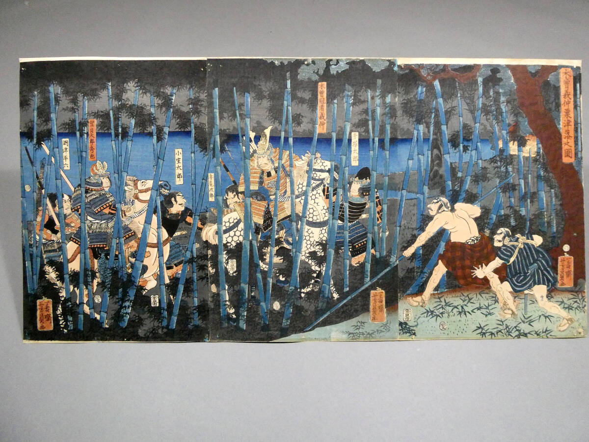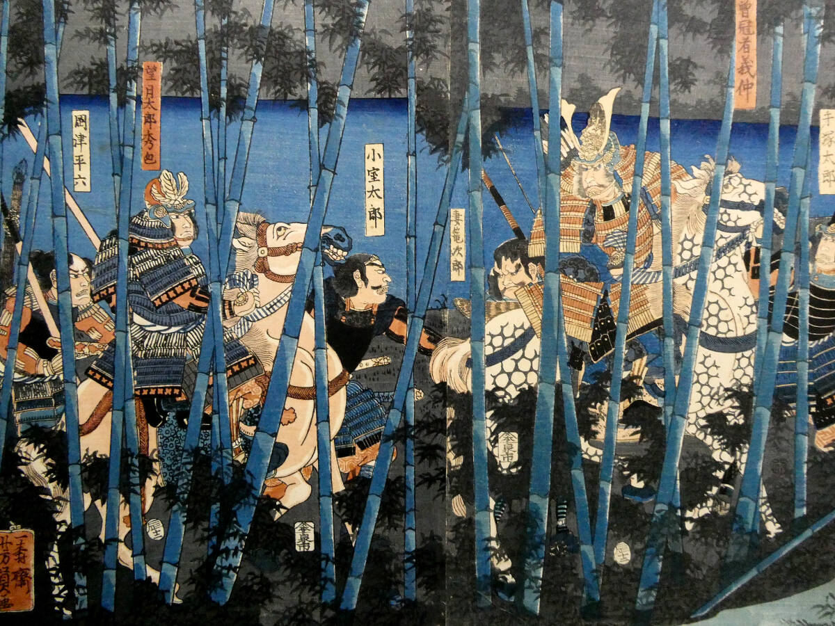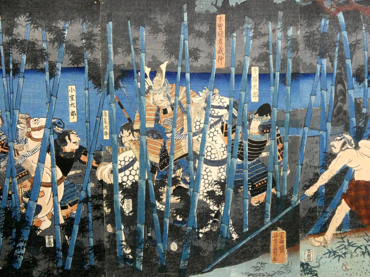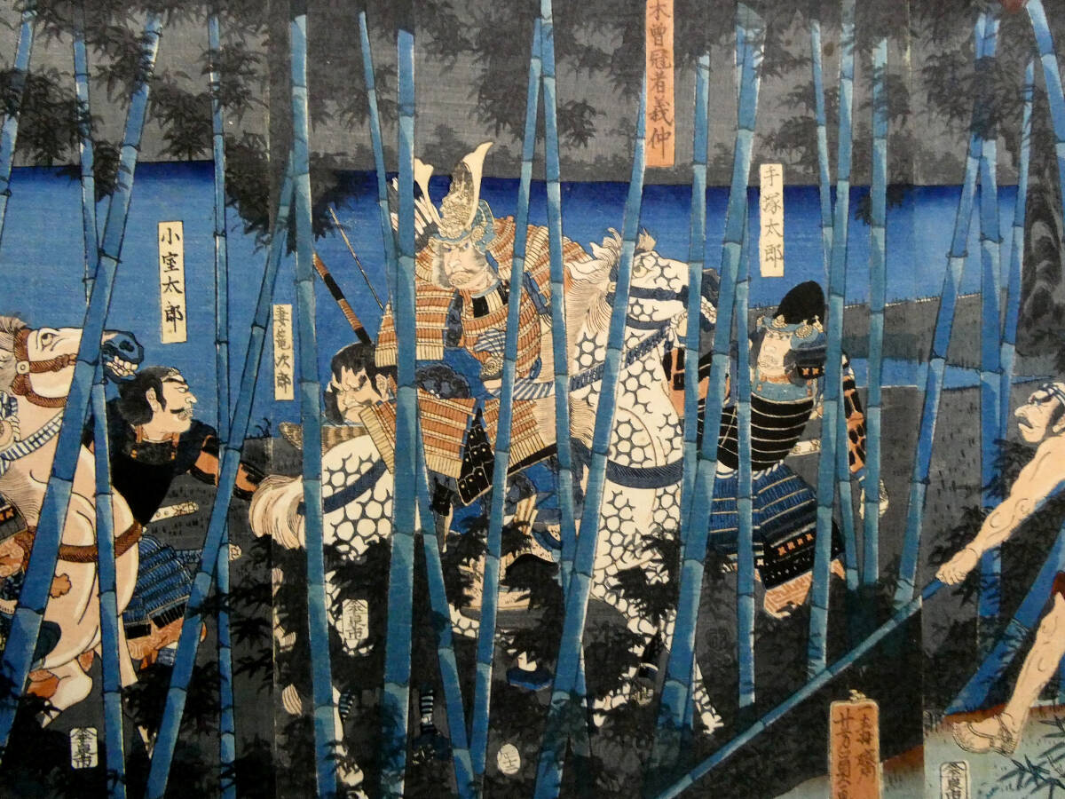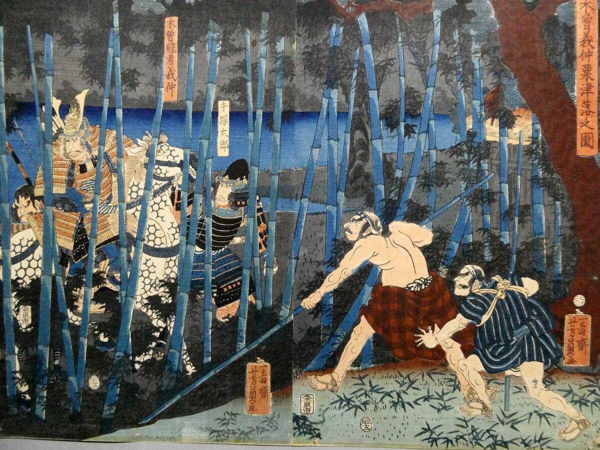 ■ 歌川芳員 江戸時代 木版浮世絵 「木曽義仲粟津落之図」3枚続揃い 義仲軍の壊滅 治承・寿永の乱 ■