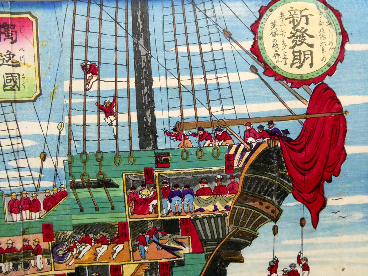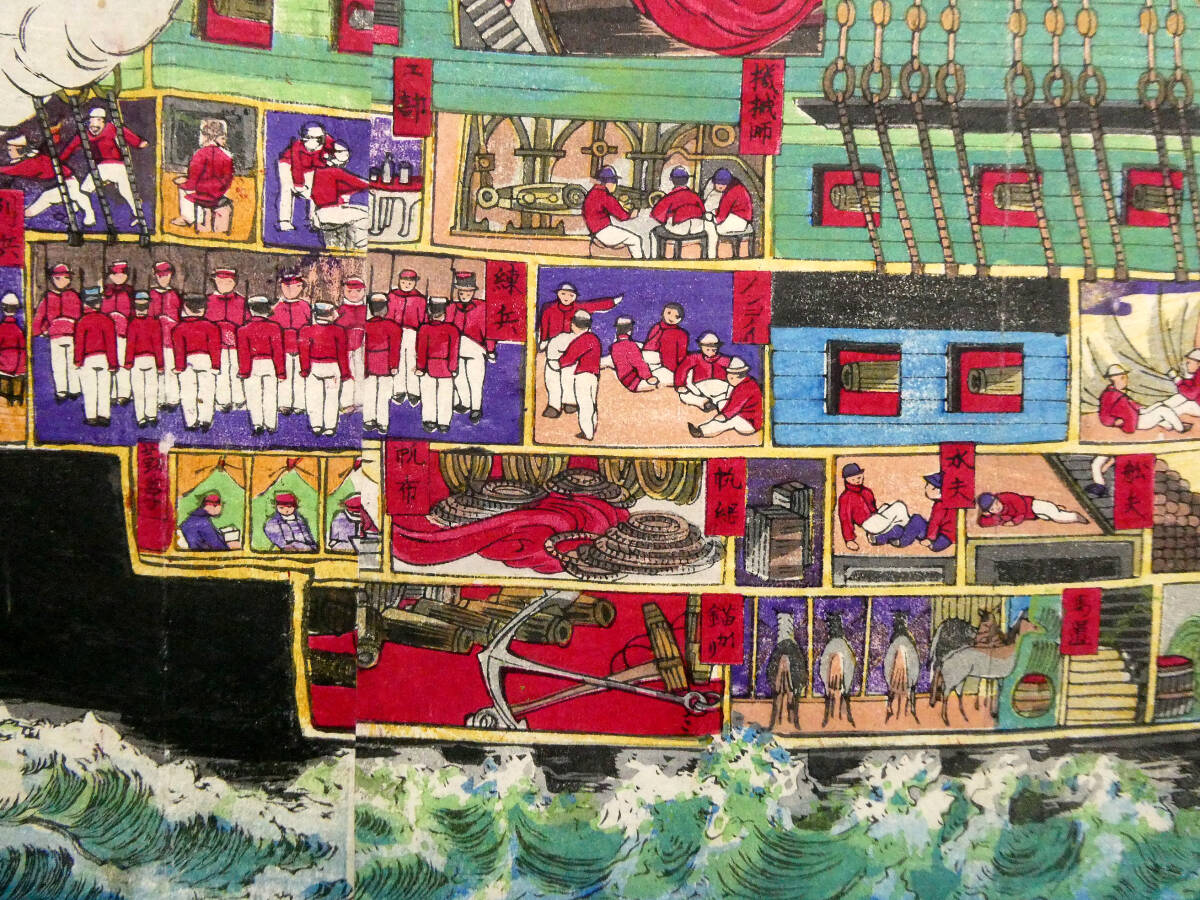 ■ 雲僊 明治初め 木版浮世絵 「独逸国軍艦内部機械図」3枚続揃い 黒船 軍艦 蒸気船の断面図 大砲の装備 ■