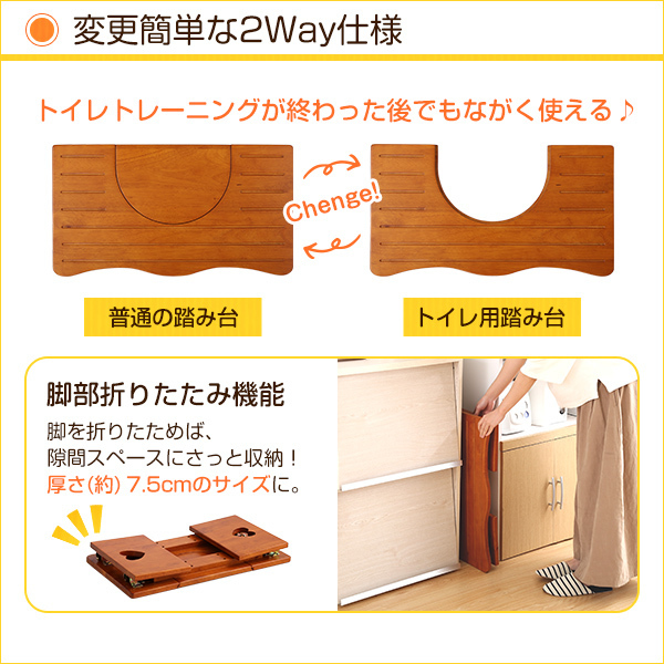 | 【ポイント】 ①トイレ用&一般的な踏み台として使える、こども踏み台です。 ②静止耐荷重(約)80㎏の丈夫な天然木製です。 ③安心を追及して角を丸く加工しています。 ④折りたためば省スペースで収納可能です。 ⑤組み立て要らずの完成品♪ |