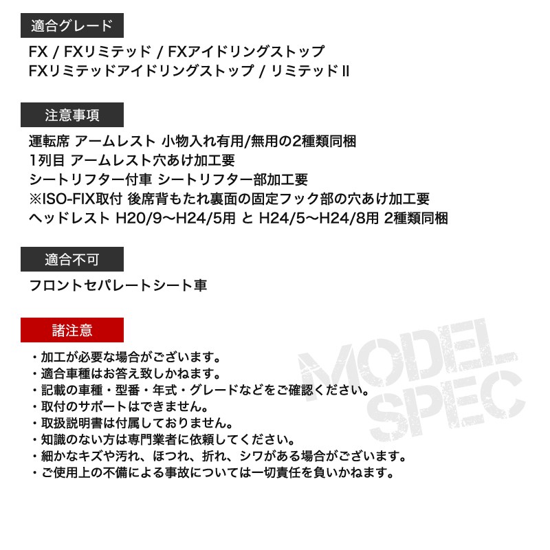 | 注意事項 | 運転席 アームレスト 小物入れ有用/無用の2種類同梱 1列目 アームレスト穴あけ加工要 シートリフター付車 シートリフター部加工要 ※ISO-FIX取付 後席背もたれ裏面の固定フック部の穴あけ加工要 ヘッドレスト H20/9~H24/5用 と H24/5~H24/8用 2種類同梱 |