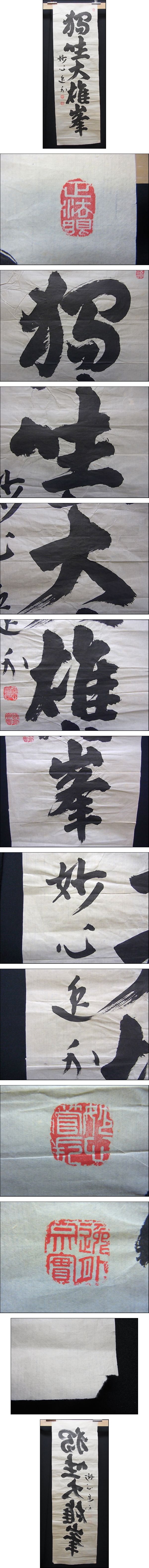 | 商品説明 | JY177◆◇メクリ 妙心寺管長 梶浦逸外 「独坐大雄峰」◇◆ ≪ サイズ ≫(若干の誤差はご了承ください) 本紙サイズ: 縦 100 × 横 31 cm 本紙材質 : 紙本 ≪ 状態 ≫ 右下すみに破損ありますが、おおむね美品 力強い立派な書です ≪ 箱行・鑑定・付属品≫ 箱なし |