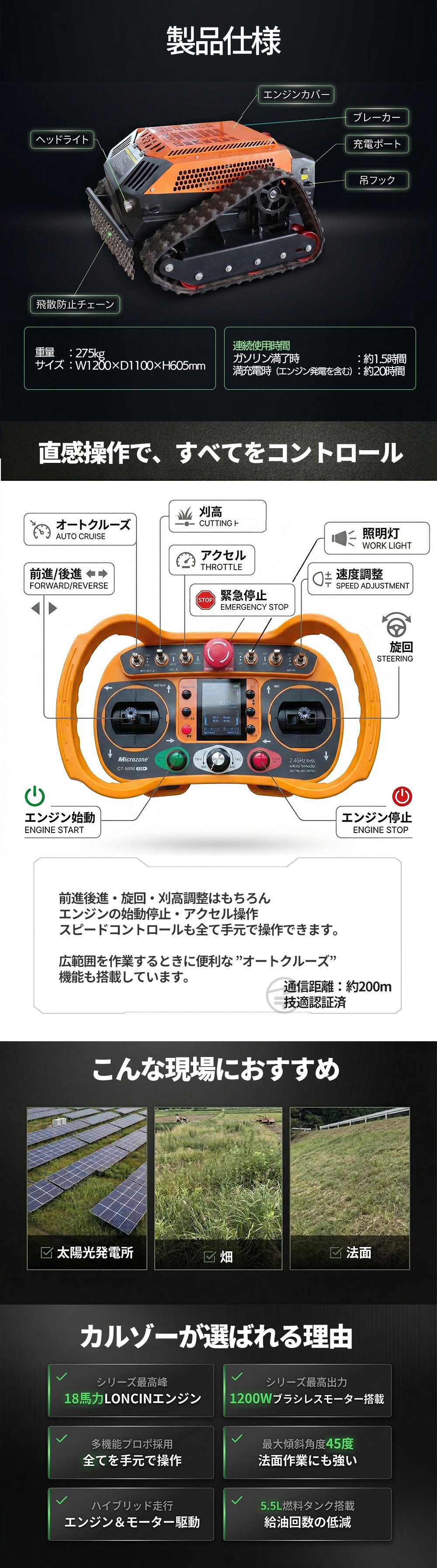 | 傾斜角度 | 最大45度 ※軟弱地、砂地など足元の悪い場合は最大傾斜角度での使用不可、あくまでも目安としてお考えください |