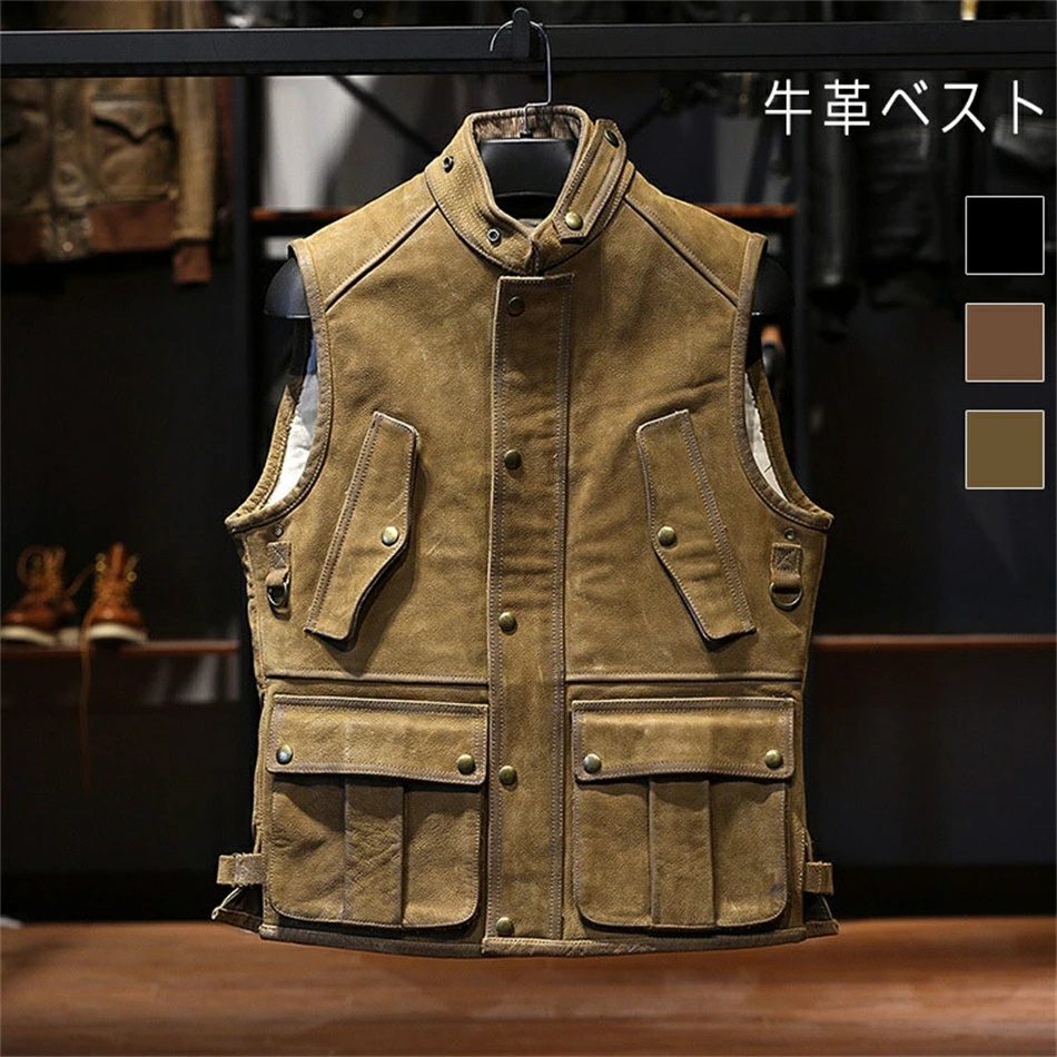 ★新品★メンズ LWMZ23-3XLサイズ カーキー 牛革ベスト レザーベスト バイク革ベスト パンク風 ライダースベスト バイクウェア 本革 收藏