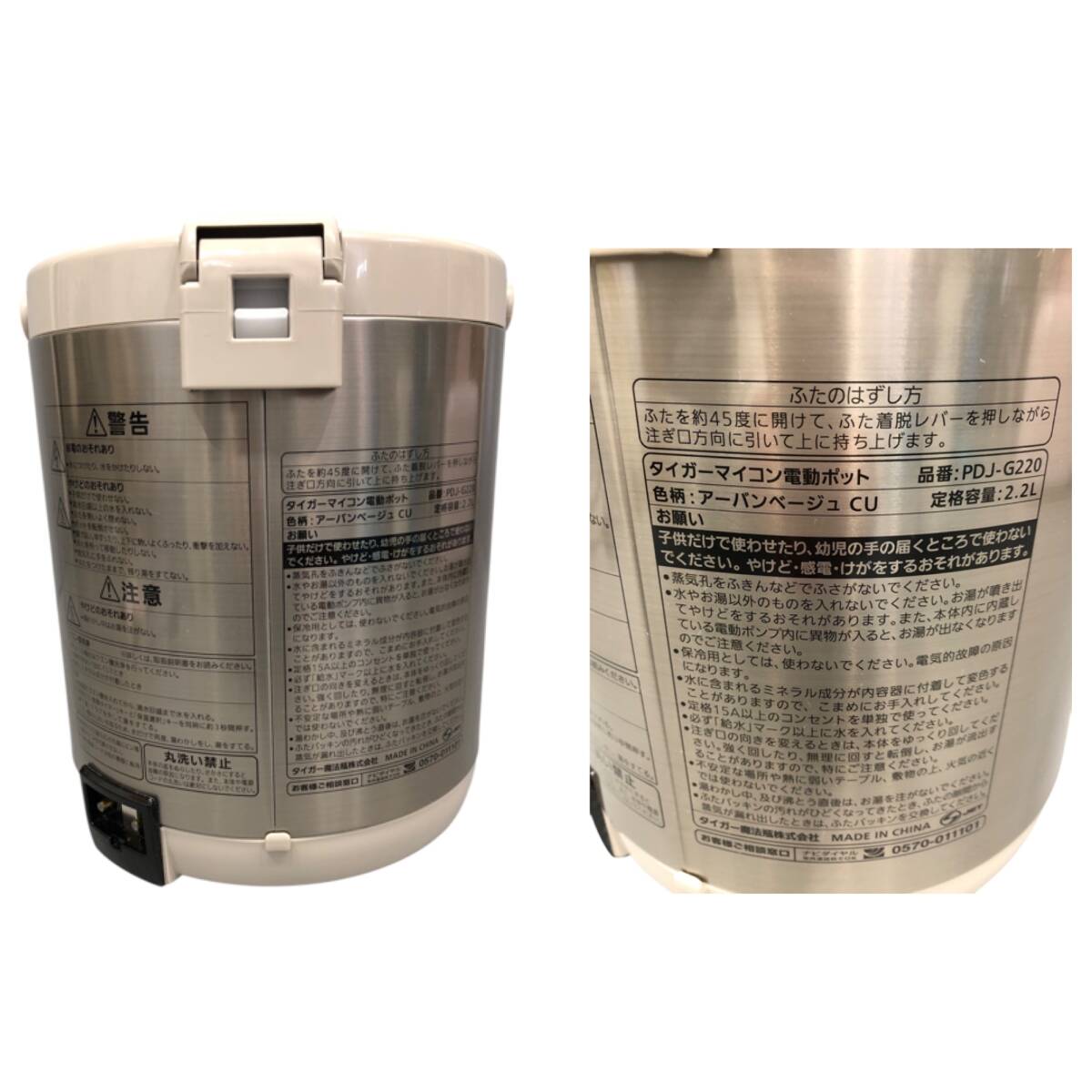 | 総合リサイクルショップ ファインドプレイスです。 当店の出品をご覧いただき、ありがとうございます。 自己紹介に当店のオークション対応(臨時休業日など含む)を記載しておりますので、入札前に必ずご確認ください。 → ファインドプレイス自己紹介 ← 送料は文末に一覧で表記しております。 発送方法は、複数ございますので入札前に必ずご確認・入札後、発送方法の選択をお願いします。 ■商品詳細■ 【メーカー】 TIGER 【商品名/型式】 マイコン電動ポット PDJ-g220 アーバンベージュCU 2.2L 【サイズ/重量】 幅 約22㎝ 奥行 約30㎝ 高さ 約25㎝ 重量 約2162g (素人寸法の為、多少誤差がありますのでご了承ください。) 【付属品】 画像に写っているものが全てです。 【商品状態/動作確認】 2008年製ですが、内部の焼けが見受けられず状態が良いです。 ポット外側は使用に伴うスレ傷、細かな汚れなどあります。 正面下の保護テープに汚れが見られますが、半分程剥がして確認しました所、本体に汚れは見受けられませんでした。 中古品の為、細かなキズ、擦れ、汚れ等は御了承下さい。 通電・電源・ボタン操作・水を入れてお湯になる事・電動給湯できる事の確認しています。 美品をお求めの方や細かな状態を気になさる方は入札をお控え下さい。 ※画像はご覧になるモニター環境で違いが出てしまうため、実際の色とは若干異なる場合があります。 ※現状出品としてノークレーム、ノーリターンとさせていただきます。  | |||