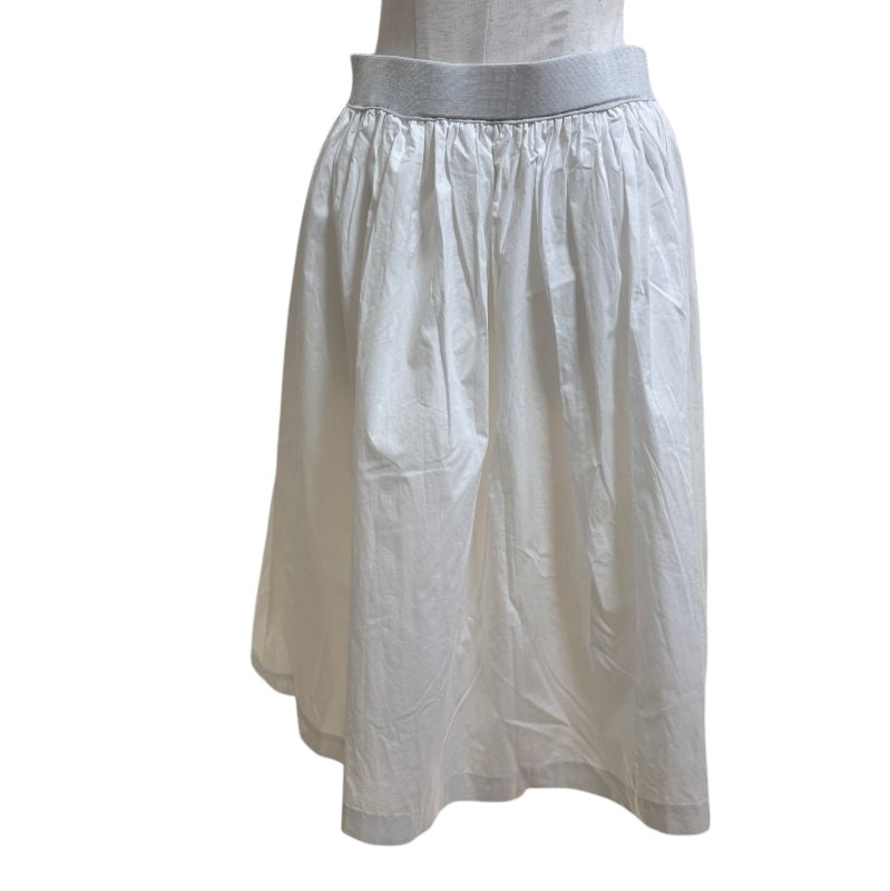ウエストゴム仕様で快適なフィット感があり、膝丈のシルエットが上品な印象を与えます。