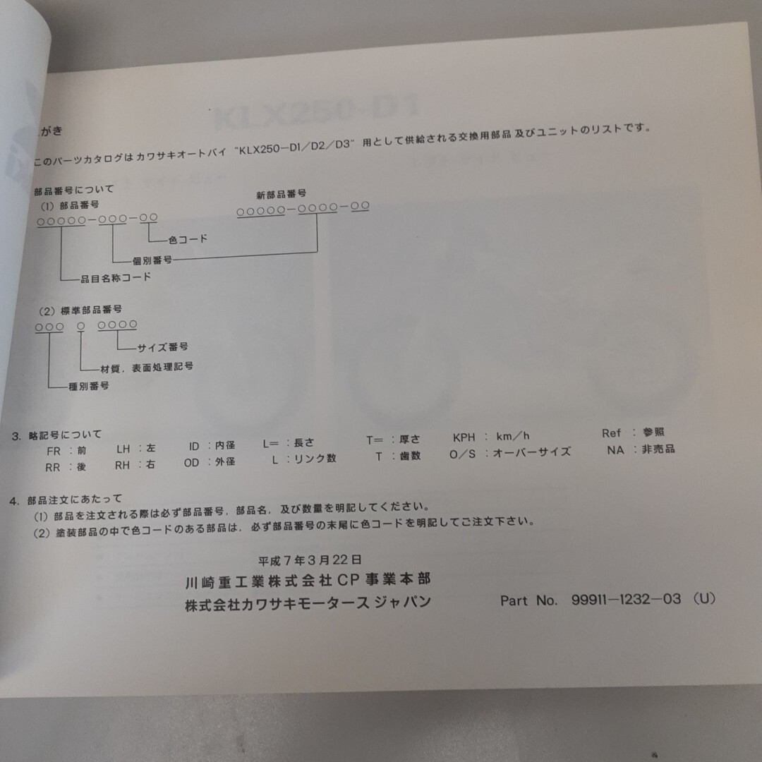 パーツカタログ カワサキKLX250-D1/D2/D3 平成7年3月22日