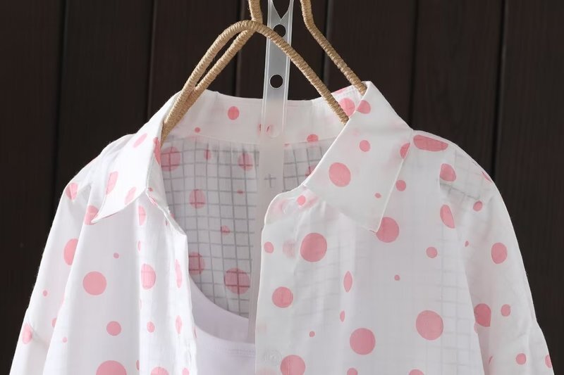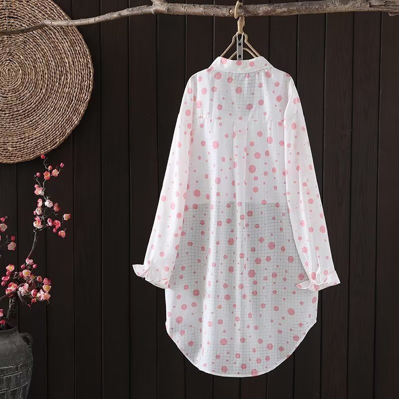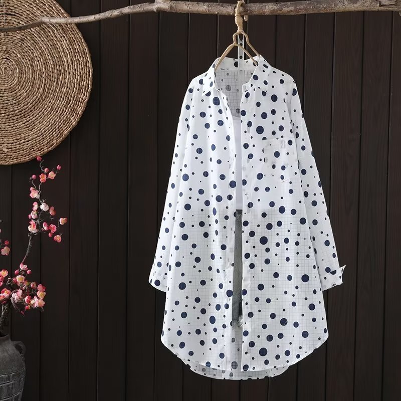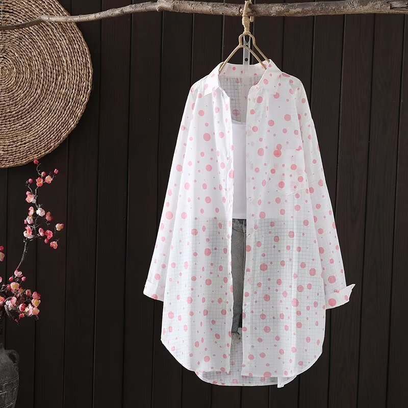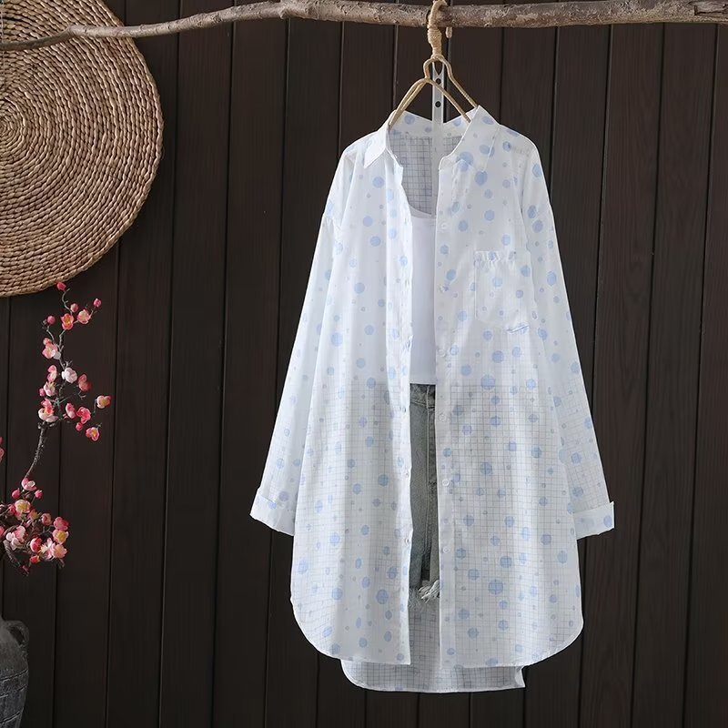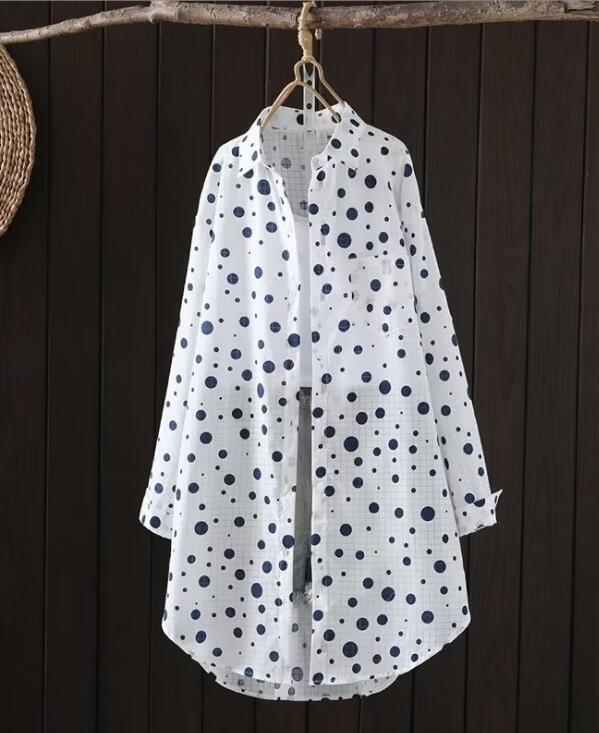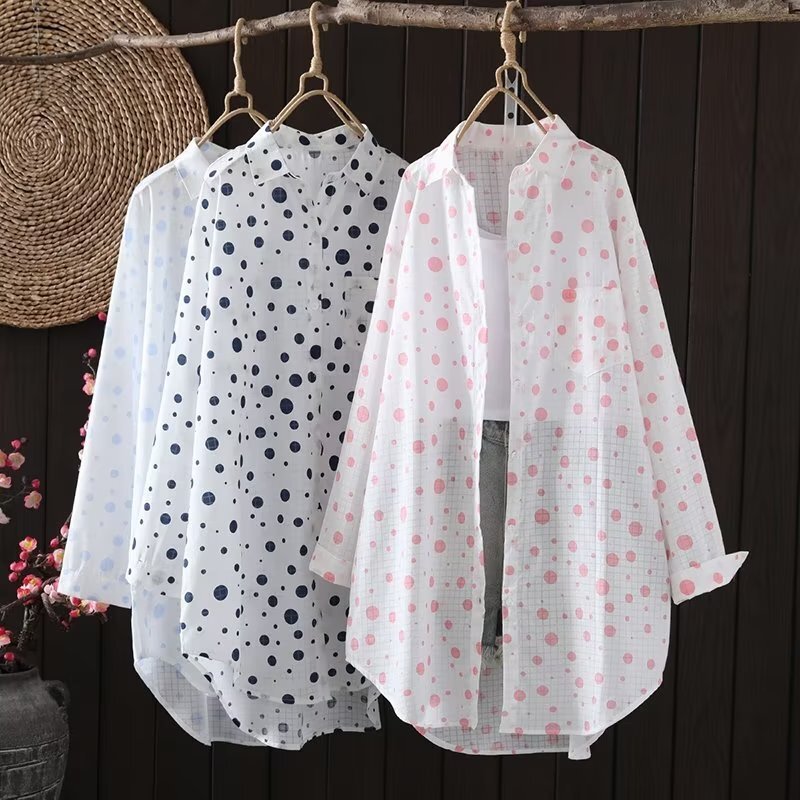 人気推薦ワイシャツ チェック柄 薄手 上品 ドット模様 大人可愛 ゆったり オシャレ フリーサイズ ナチュラル 綿100% ネイビー 收藏