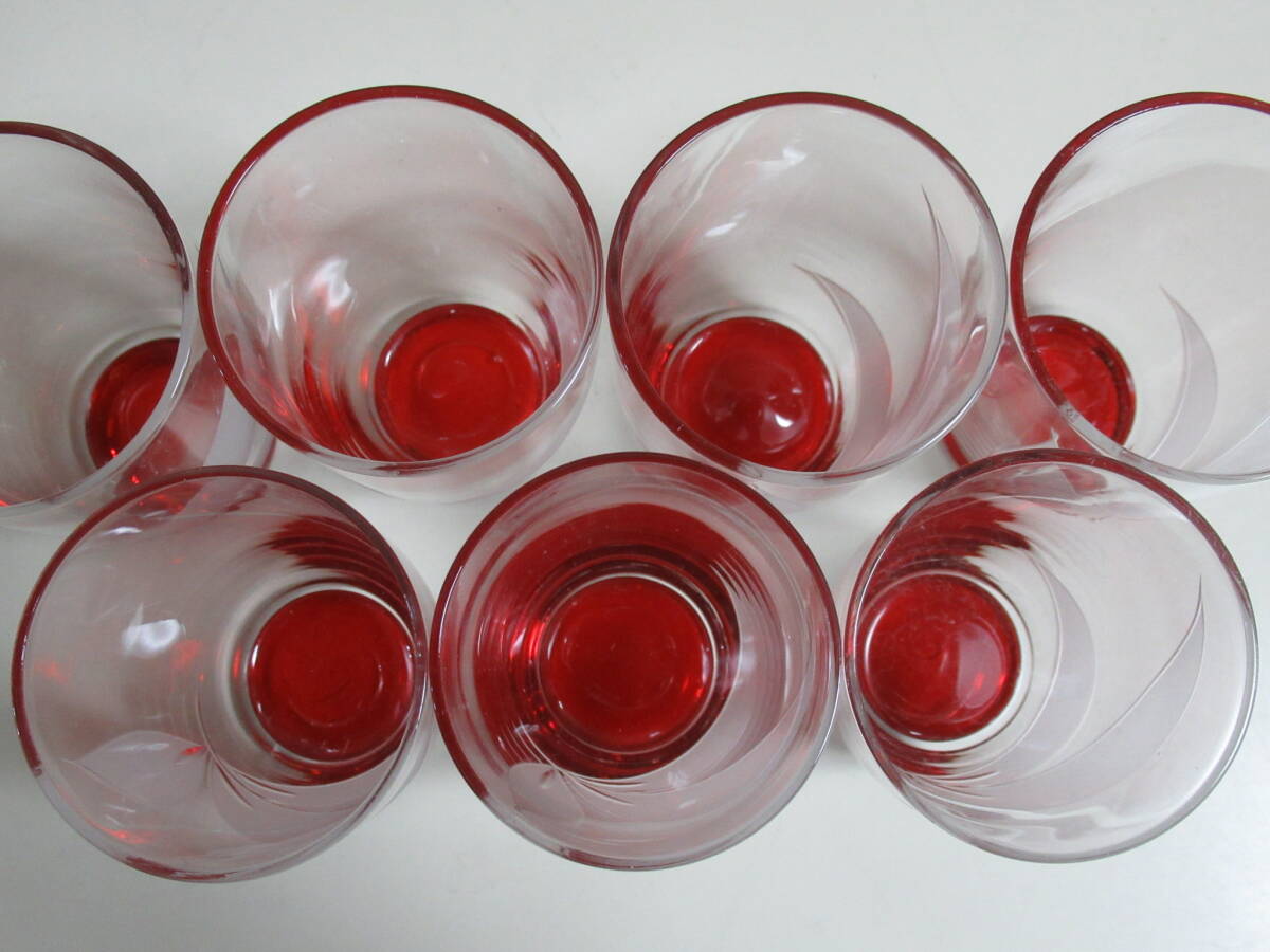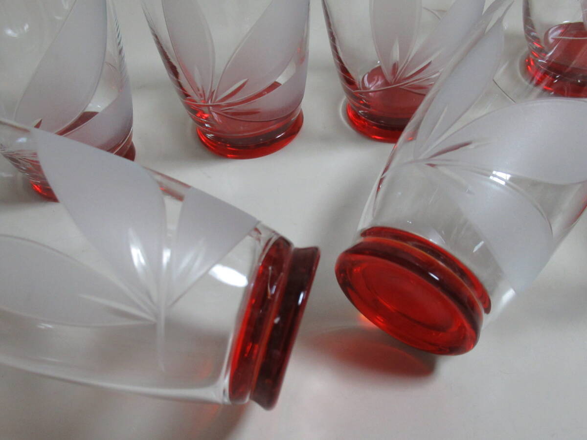R7 06★レトロアンティーク タンブラーグラス 7個セット【底:赤色・葉模様カッティング】硝子 コップ 收藏
