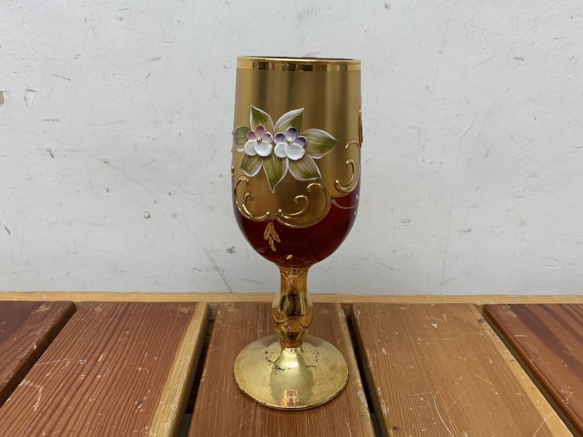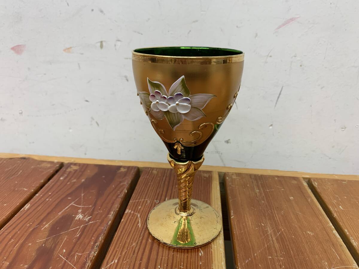 処分特価品★【ベネチアングラス/ムラーノ/九谷焼】深藍譜 鳳凰【ワイングラス】4個セット シャンパン 金彩 中古品 收藏