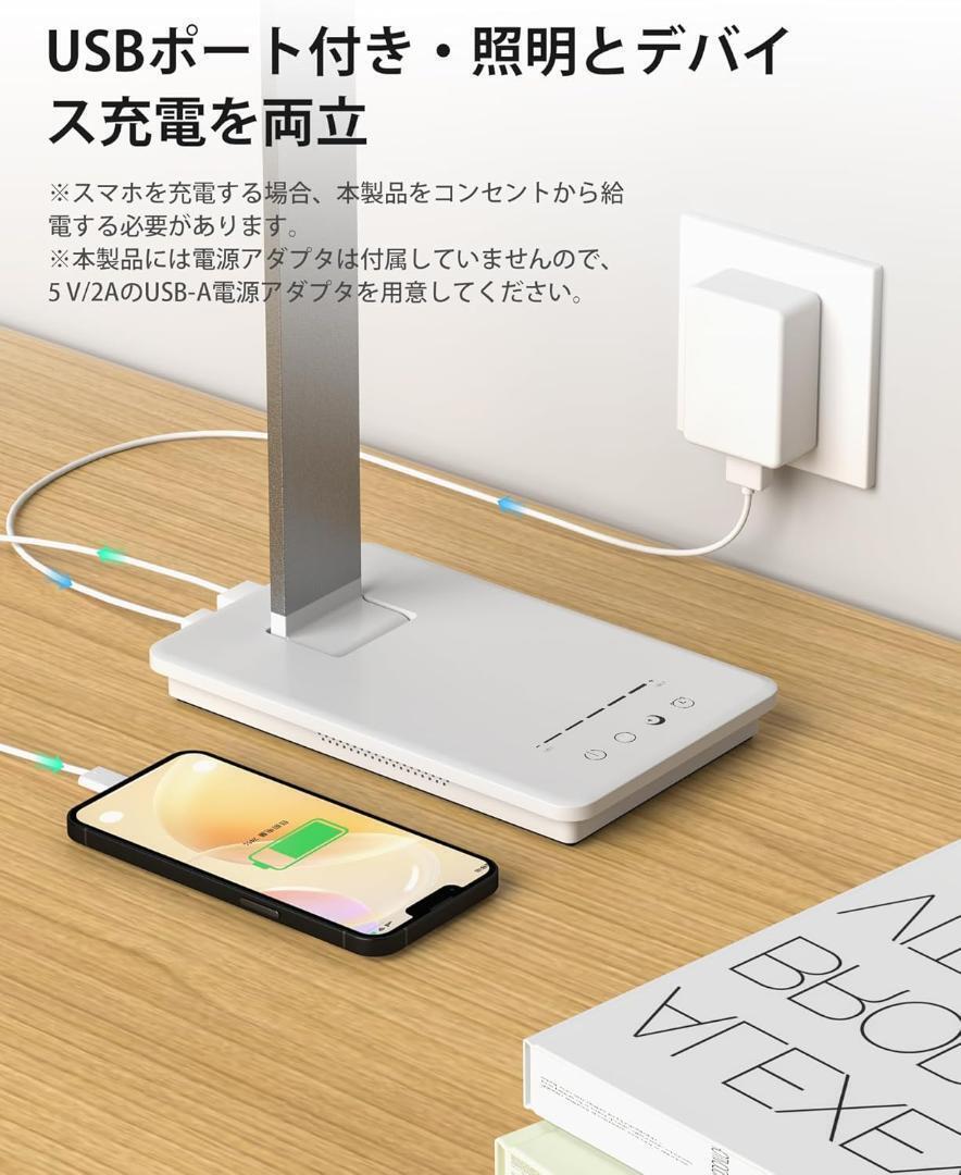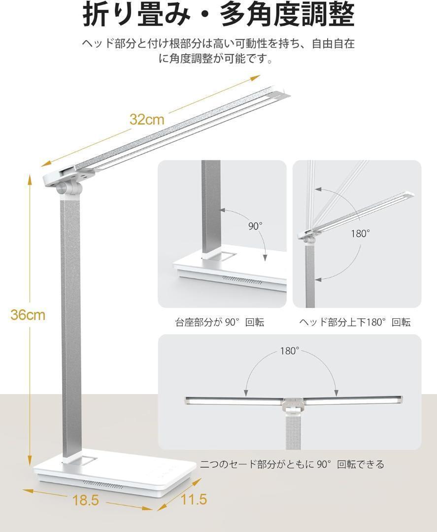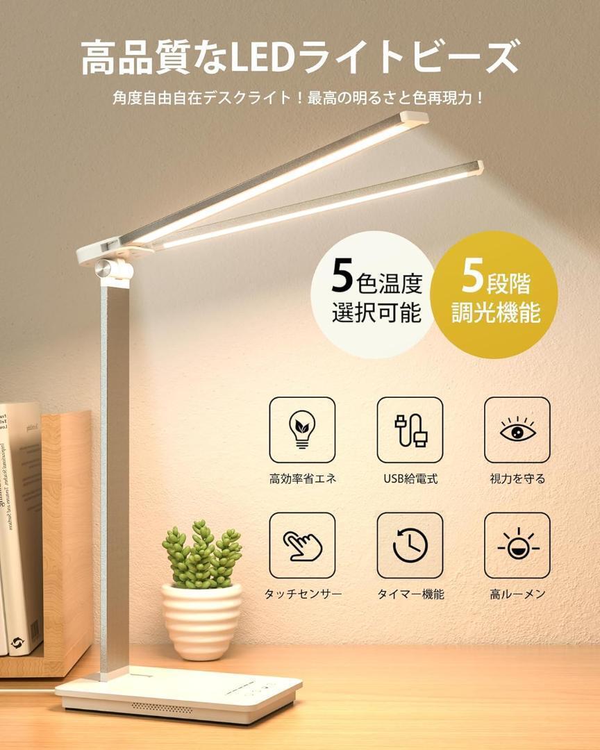 スタンドライト デスクライト ダブルライトバー 超高輝度 5段階調光・調色 タッチセンサー 多角度調整 タイマー機能 省エネ 学習机用 LEDライト 読書灯 (ホワイト)D8白【5段階調光・調色でシーンに応じた最適な照明】新型LEDデスクライトは最大1300ルクスの高照度を誇り、勉強、読書、リラックスタイムなど、あらゆるシーンに合わせた明るさを提供します。5段階の調光・調色機能により、用途に応じて簡単に調整が可能です。例えば、集中したいときには冷色光で明るく照らし、リラックスしたいときには暖色光で落ち着いた雰囲気を作り出すことができます。タッチセンサーによる直感的な操作で、煩わしい設定も一切不要です。【折りたたみ式アームとダブルヘッドで自在な調整】高品質なアルミ素材を使用し、アームの角度や高さを自由に調整できるため、照明の角度をお好みで変えられます。ダブルヘッドデザインにより、広範囲に光を拡散し、デスク全体を均一に照らすことが可能です。影が気になる場面では、2つのライトヘッドの向きを調整することで、影を最小限に抑えることができます。使用後はコンパクトに折りたたんで収納でき、デスクスペースをすっきりと保つことができます。【便利なタイマー・メモリー機能とナイトライト】30分と60分のタイマー機能を備えており、設定時間が経過すると自動的に消灯しますので、消し忘れの心配がありません。記憶機能も搭載しており、前回使用時の明るさや色温度を自動的に保存しますので、再度調整する手間が省けます。ナイトライト機能は3段階の光調節が可能で、温かみのある柔らかな光が就寝時やリラックスタイムに最適です。【目に優しい平面発光と高演色性】このデスクライトは、目に優しい設計を追求しています。平面発光により、多重影や照明ムラを効果的に抑え、目の疲れを軽減します。さらに、88個の高演色LEDチップを採用し、自然な色再現を実現。長時間使用しても目に負担がかかりにくく、子供から大人まで安心して使用できます。【省エネ設計と多様な給電方法】高効率なLED技術により、消費電力を大幅に抑え、電気代の節約にも貢献します。使用寿命も長く、長期的に見てコストパフォーマンスに優れた選択です。USB給電にも対応しており、PCやモバイルバッテリーから手軽に電源を供給できます。さらに、ライトの背面にはUSBポートがあり、読書中にスマートフォンを充電することも可能です。
