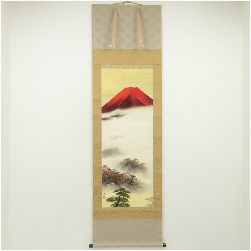 内海泰筆 赤富士 肉筆絹本掛軸(共箱・二重箱) 收藏