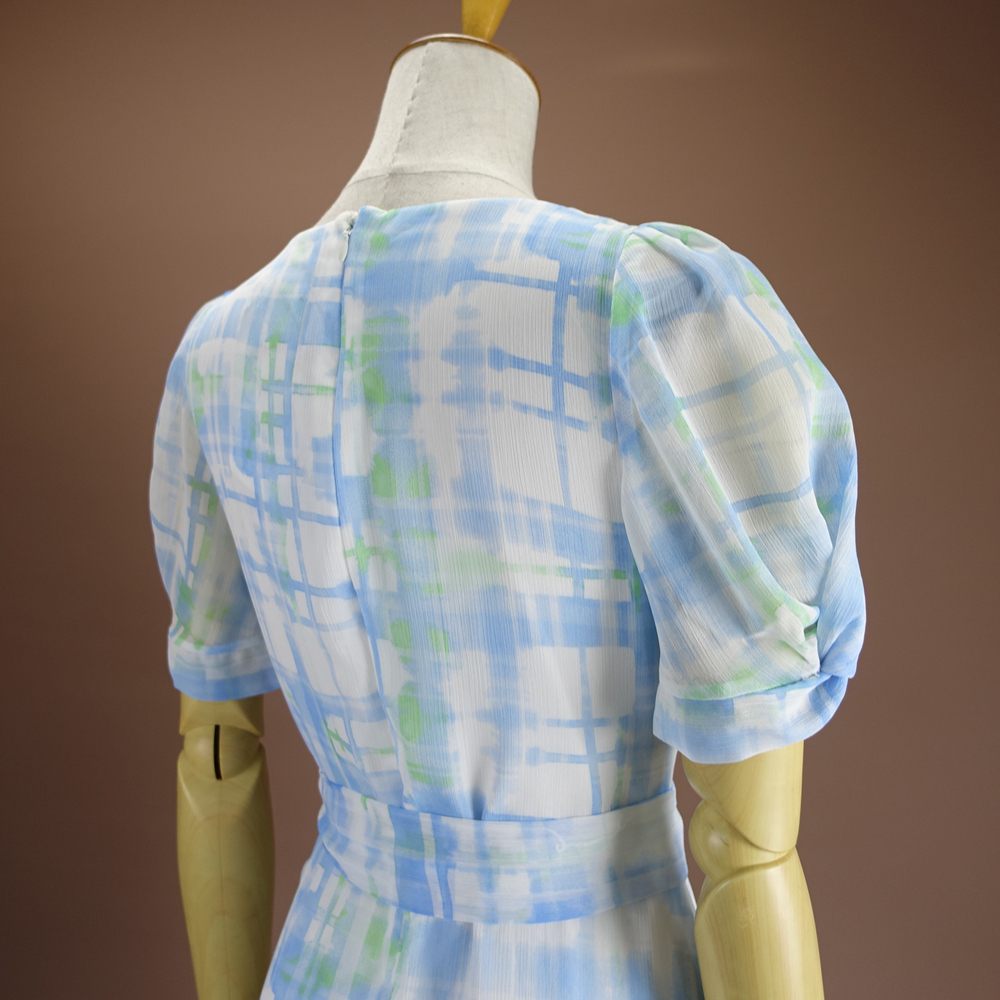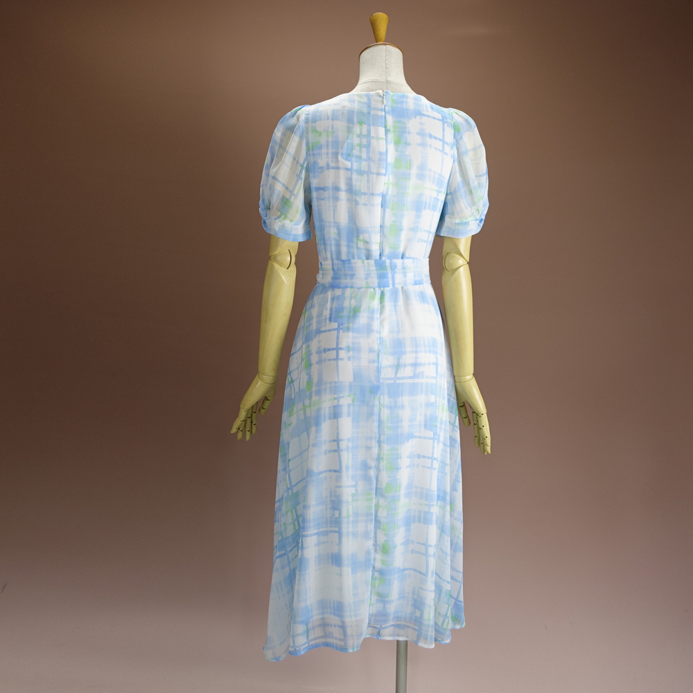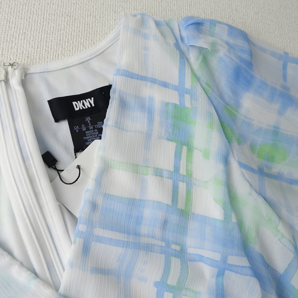 新品DKNY 11号ダナキャランニューヨーク 水色 白 黄緑 ロング パフスリーブ 半袖 フレア ワンピース ドレス 華41W2802 收藏