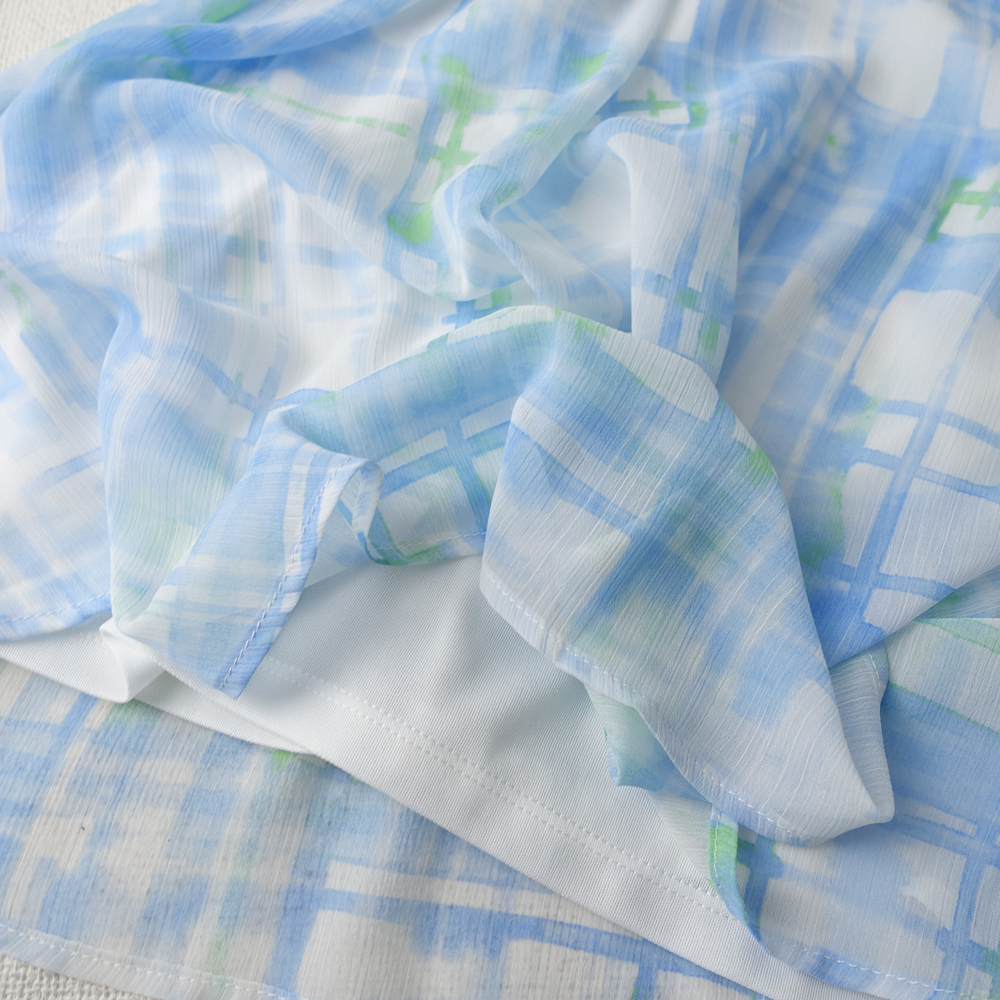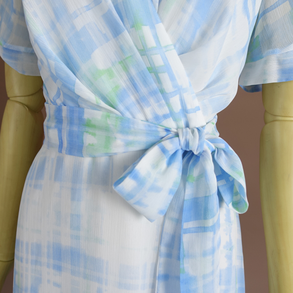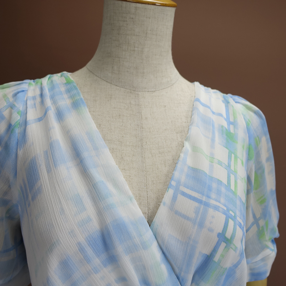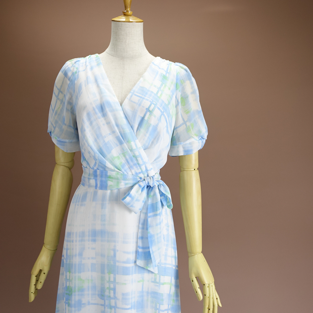 新品DKNY 11号ダナキャランニューヨーク 水色 白 黄緑 ロング パフスリーブ 半袖 フレア ワンピース ドレス 華41W2802 收藏